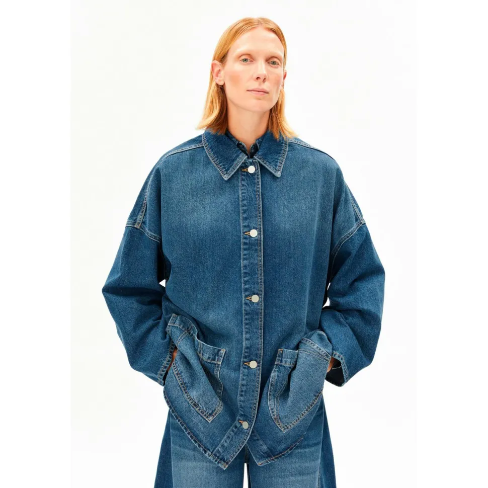 Die Women’s Draapy Denim Jacket von ARMEDANGELS eignet sich hervorragend, um sie im Alltag zu tragen. Sie ist atmungsaktiv und schmiegt sich dank der Verarbeitung von Baumwolle angenehm an Deinen Körper an. Die Materialzusammensetzung enthält 25 % recycelte Baumwolle. Dank der durchgehenden Knopfleiste kannst Du sie schnell und unkompliziert öffnen und schließen. Außerdem kannst Du sie offen, aber auch geschlossen tragen. Kombiniere sie zur Jeans, aber auch zur Chino. Sie ist ein echter Allrounder für Deinen Alltag.