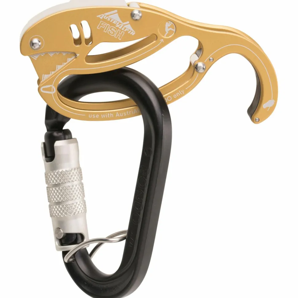 Der Ablasshebel ermöglicht ein gleichmäßiges, angenehmes Ablassen. Damit seine volle Funktion gewährleistet ist, wird der Fish ausschließlich mit dem Rondo HMS Karabiner von AustriAlpin ausgeliefert, der auf das Sicherungsgerät zugeschnitten ist und sich dank des Bügels nicht am Gurt verdrehen kann!