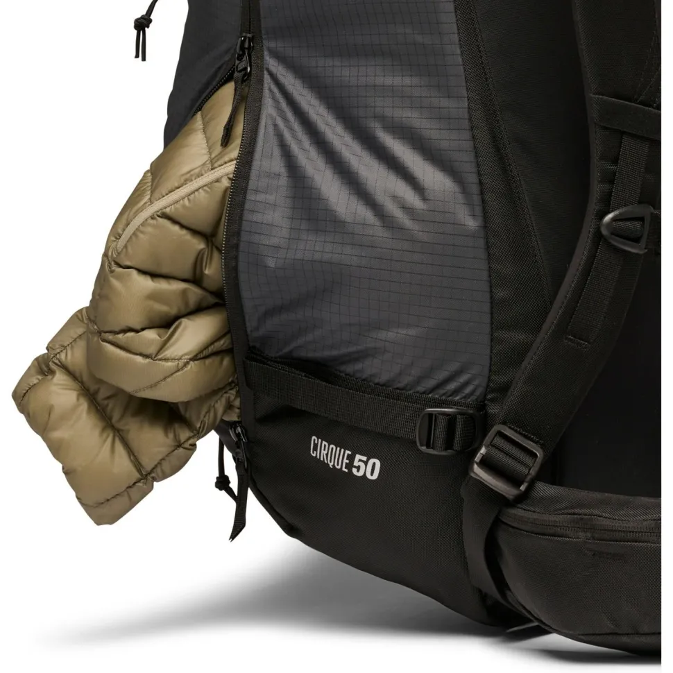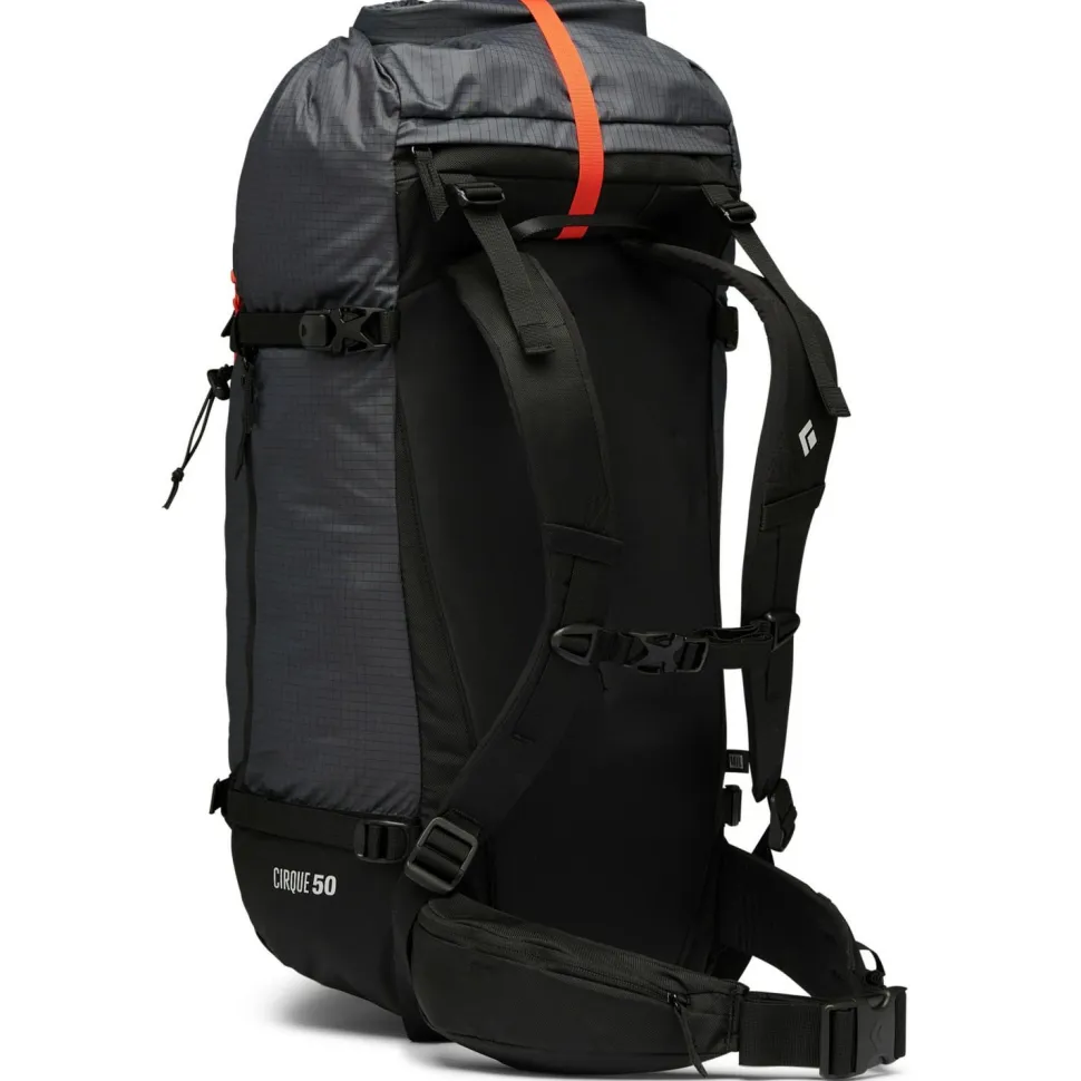 Der Cirque 50 ist mit einem Rollverschluss und zusätzlichem Frontreißverschluss ausgestattet. Die Ski lassen sich entweder diagonal oder als A-Frame am Rucksack befestigen. Auch der Transport von Snowboard oder Splitboard ist für den großen Rucksack kein Problem.