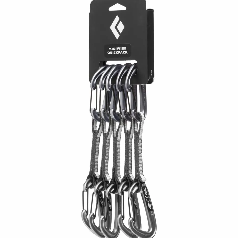 Für ein geringes Ausrüstungsgewicht beim Klettern sorgt der Miniwire Quickpack von Black Diamond. Denn dieser praktische Pack bringt gleich sechs Expresssets mit geringem Gewicht. Durch den Einsatz von MiniWire-Karabinern sind diese leicht und sicher zugleich. Der Grund hierfür liegt unter anderem beim Drahtschnapper, der aufgrund seines geringen Eigengewichts nicht auffedern kann. Die Bänder aus Dynex sind ebenfalls sehr leicht, kommen aber auch mit vermehrtem Felskontakt gut klar. Hierdurch sind diese Expressset sowohl fürs Sportklettern, als auch für den alpinen Einsatz bestens geeignet.