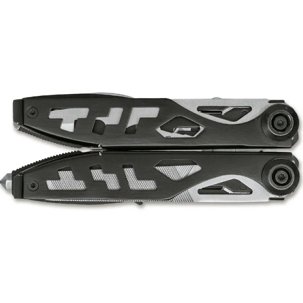 Der zusätzliche Gurtschneider wird per Nagelhau geöffnet. Die flachen Griffschalen sind mit dekorativen Aussparungen versehen und werden aus Edelstahl gefertigt. Zwei beidseitige Bits, ein entsprechender Bithalter und ein praxistauglicher Glasbrecher vervollständigen die Ausstattung.