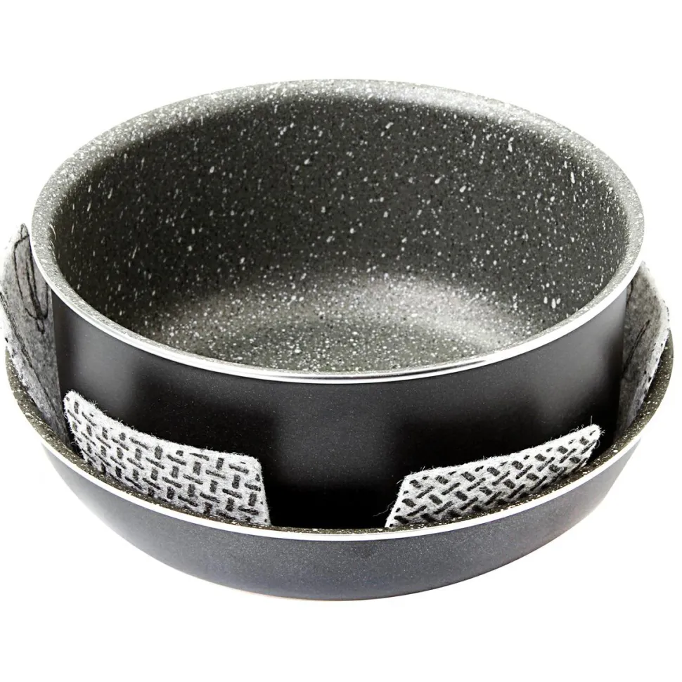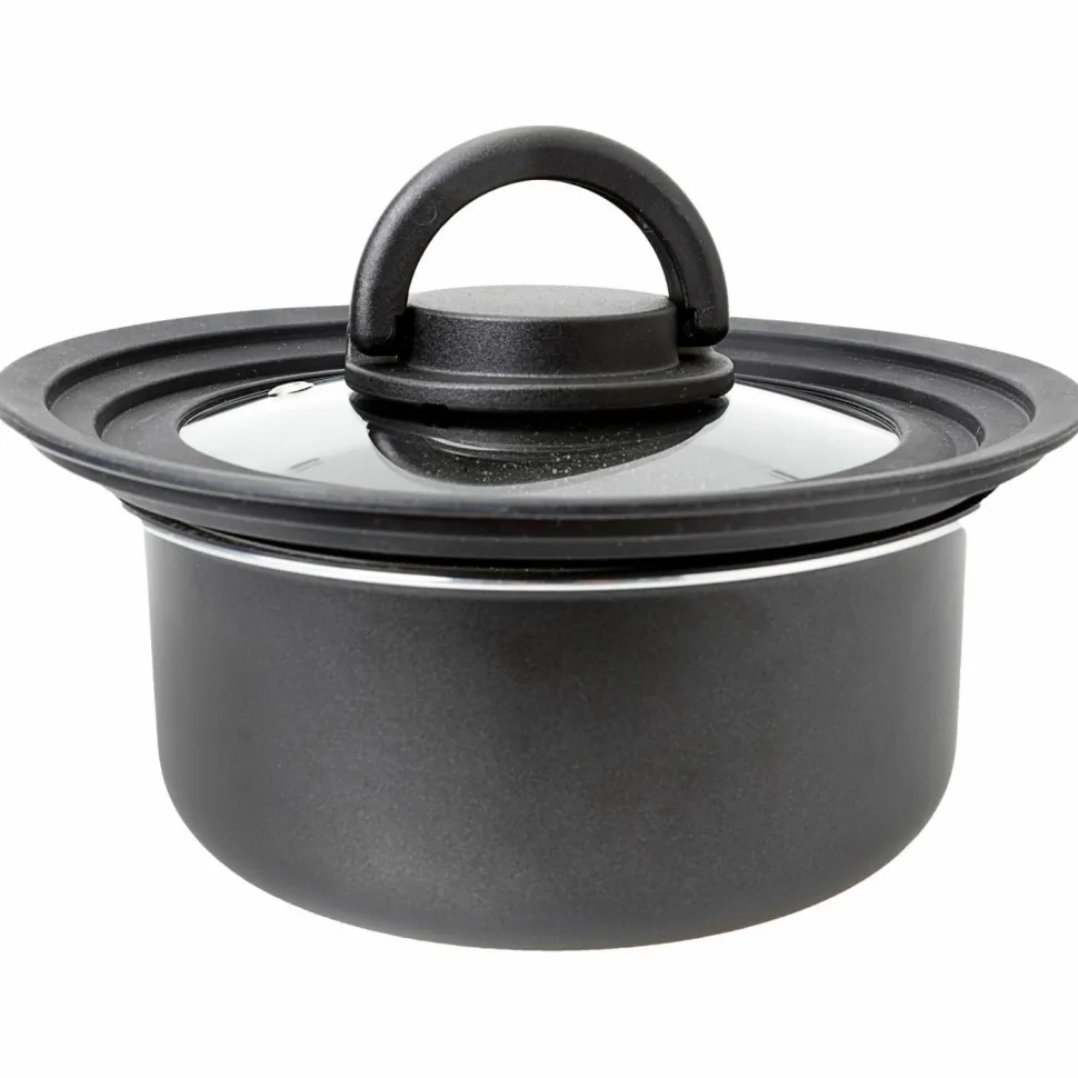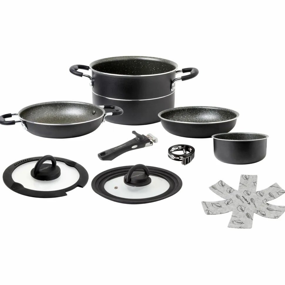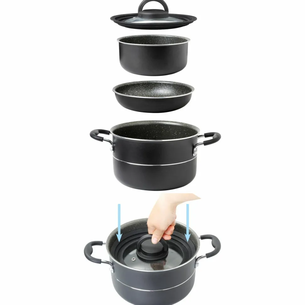 Der Camper ist mit dem Topfset Pirate NG von Brunner auf der sicheren Seite! Das mehrteilige Set besteht aus zwei Töpfen und zwei Pfannen, einem fixen Deckel und einem verstellbaren Deckel und einem Griff. Dank mehrlagiger Beschichtung der Pfannen und Töpfe ist fettfreies und schonendes Braten problemlos möglich. Das Set lässt sich platzsparend ineinander stapeln.
