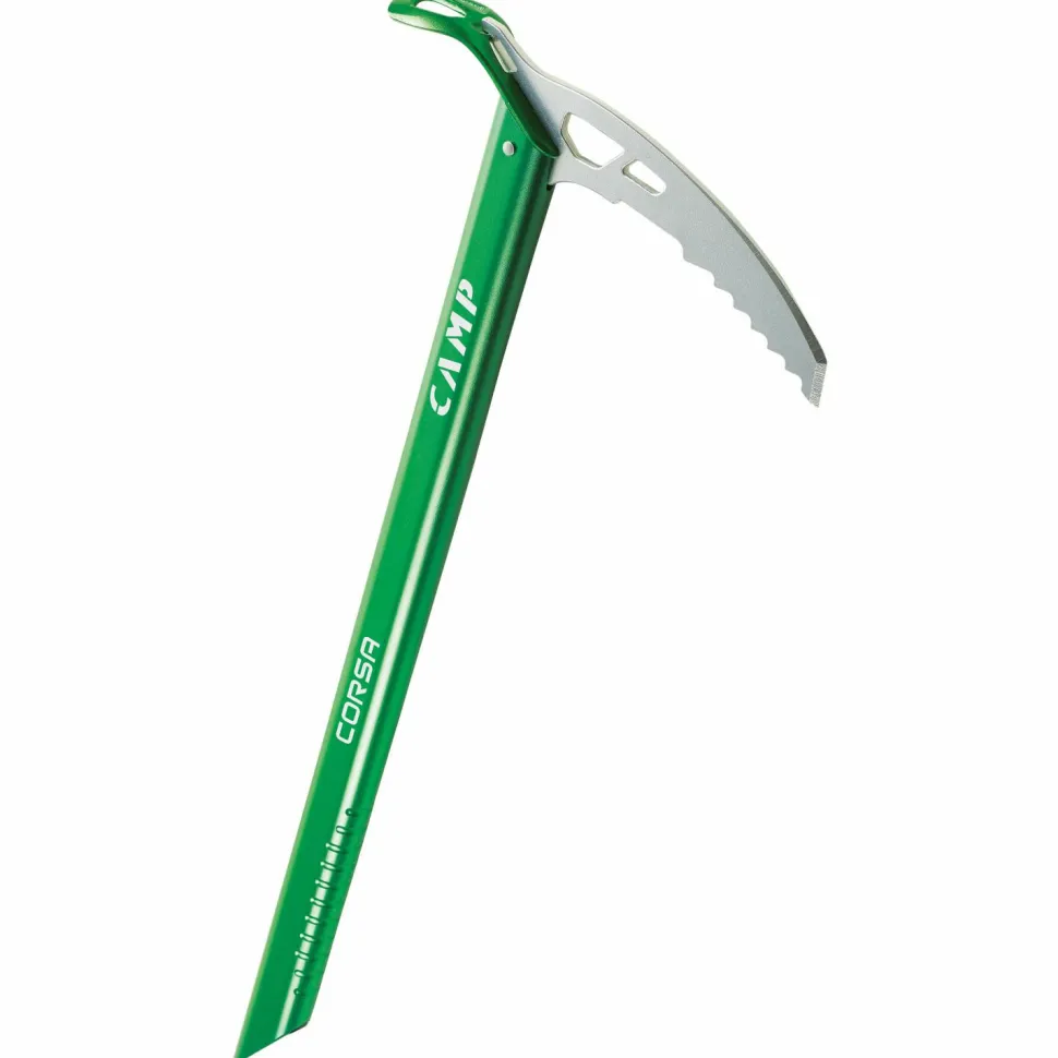 Hoch- und Skitouren sind die Kernkompetenz des Corsa von Camp. Dieser leichte, aber dennoch leistungsstarke Eispickel überzeugt durch sein gutes Handling sowie das innovative Design. Sowohl für den Schaft, als auch für die Haue kommt hier leichtes aber dennoch widerstandfähiges Aluminium zum Einsatz. Schaut man die Haue einmal näher fallen zahlreiche kleine Details auf. So wurde hier auf ein abgerundetes Kopfdesign sowie eine nahtlose Verbindung von Schaft und Haue geachtet, was nicht nur das Handling erleichtert, sondern auch Beschädigungen an den Handschuhen vorbeugt. Außerdem lässt sich hier eine Handschlaufe problemlos anbringen.Um Gewicht zu reduzieren ist der Schaft vergleichsweise dünnwandig, was durch seine Form jedoch nicht zulasten der Sicherheit geht. Der Schaft entspricht Vorgaben der EN 13089 Typ 1, sodass er als Brems- und Ankerpunkt eingesetzt werden kann.