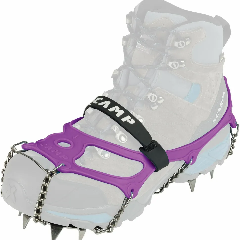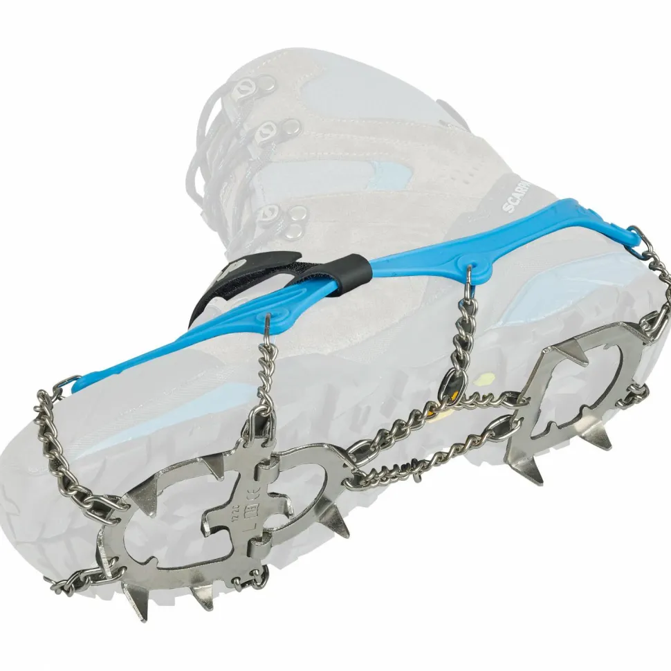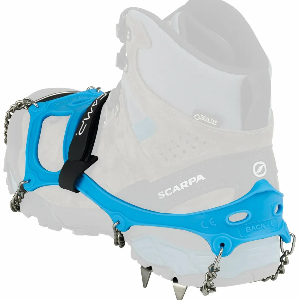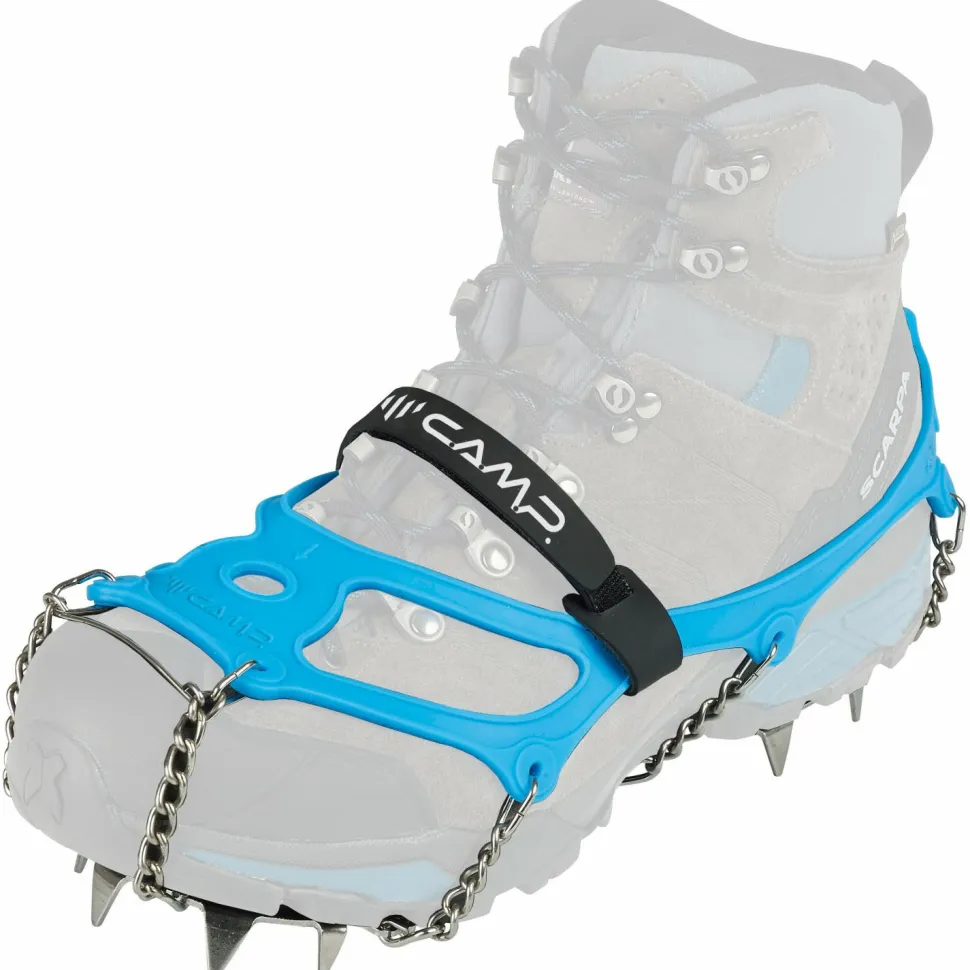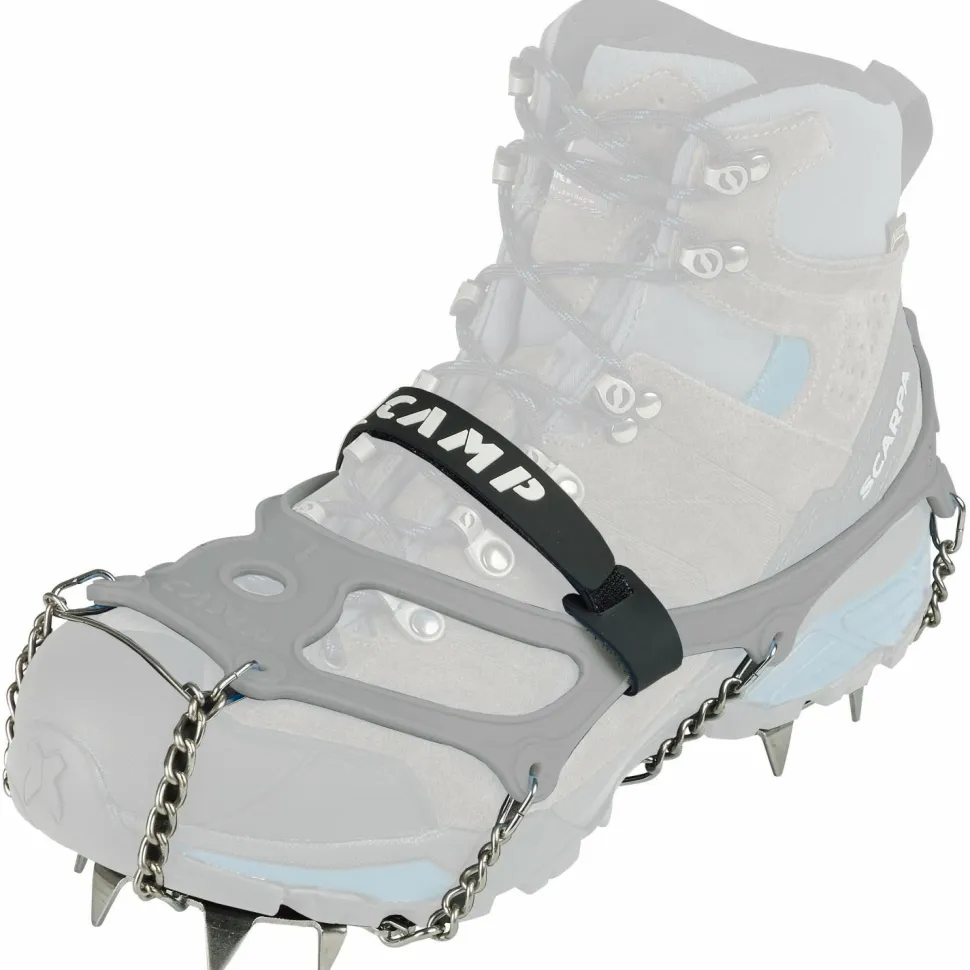 Die Grödel lassen sich bei Bedarf rasch über Deine Bergschuhe oder Winterstiefel ziehen und sitzen durch das flexible Gummiband sicher am Schuh. Ein anpassbarer Klettverschluss auf der Oberseite ermöglicht eine zusätzliche Fixierung, damit die Ice Master Evo von Camp in steilem Gelände nicht vom Schuh rutschen.
