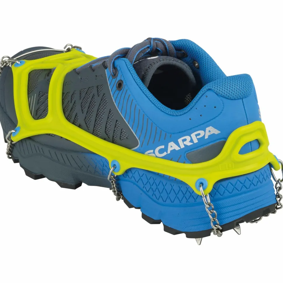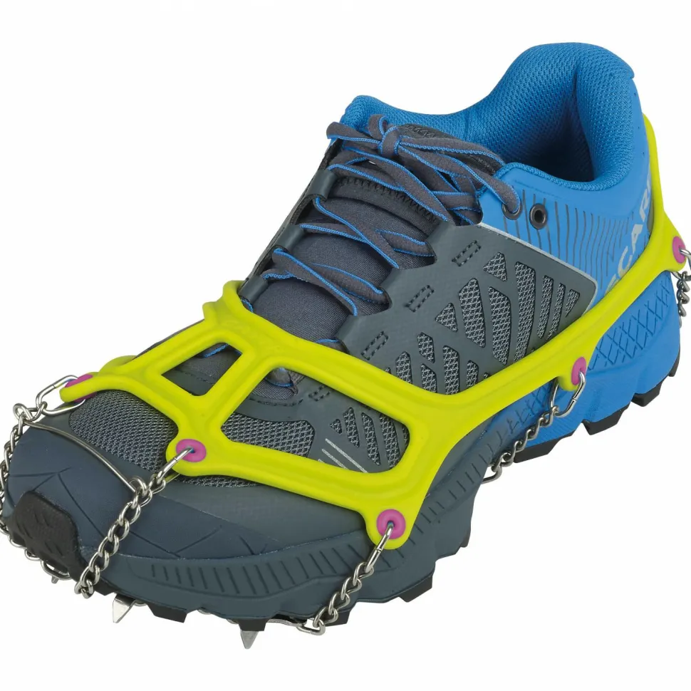 Die Ice Master Run Grödel von Camp wurden speziell für den Einsatz mit Laufschuhen und Trailrunningschuhen entwickelt. Durch eine praktische Lasche auf der Rückseite lassen sich die Spikes bei Bedarf rasch über die Schuhe ziehen. Das elastische Befestigungssystem ist aus besonders flexiblem Material hergestellt und passt sich individuell an Deine Runningschuhe an.