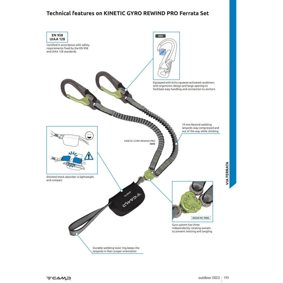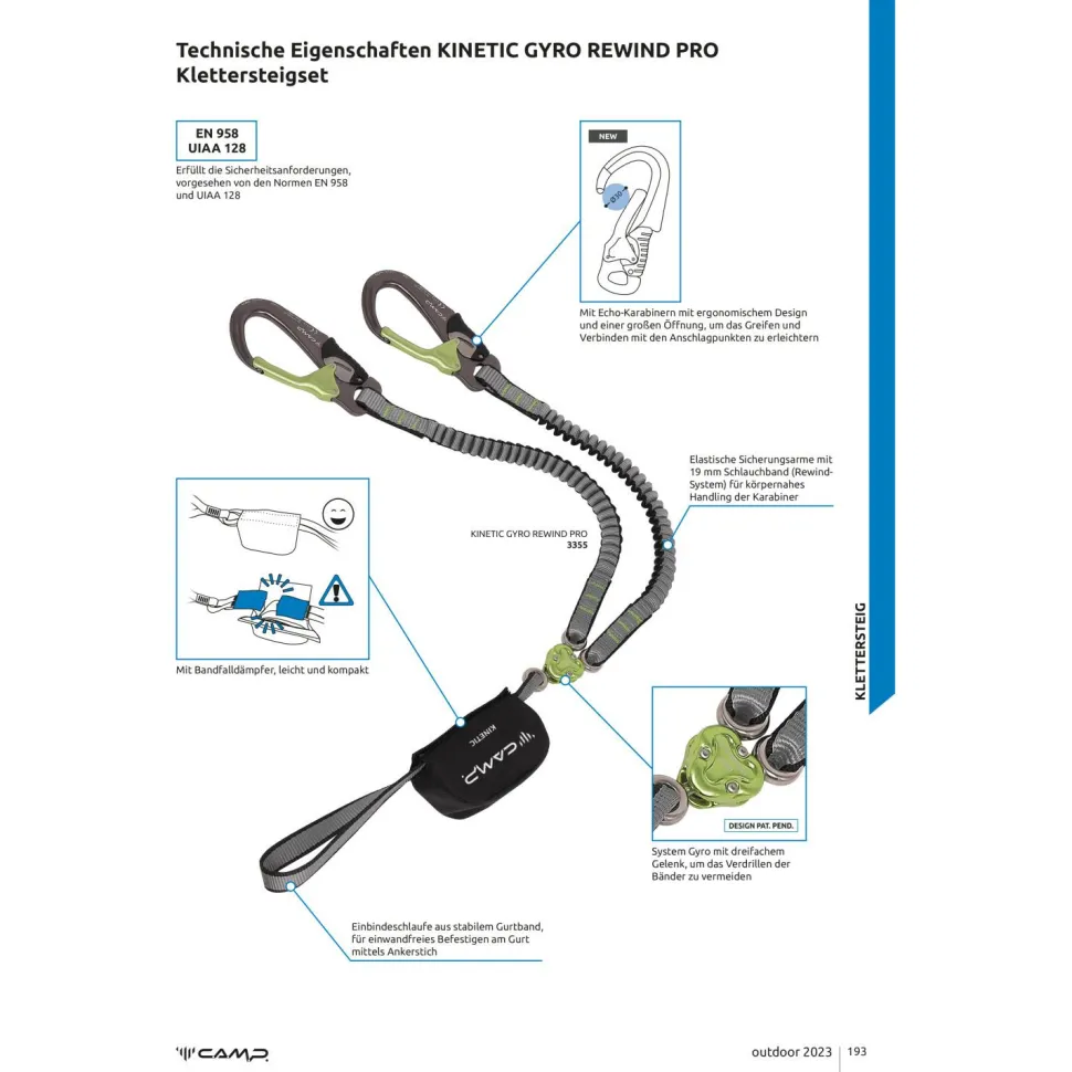 Das Kinetic Gyro Rewind Pro Klettersteigset von C.A.M.P. ist mit dem dreifachen Gyro Wirbelgelenk zwischen Bandfalldämpfer und elastischen Sicherungsarmen besonders bedienerfreundlich. Mit 19 mm breitem Schlauchband, Rewind-System und ergonomischen Echo Karabinern ergänzt C.A.M.P. das ausgeklügelte Klettersteigset.