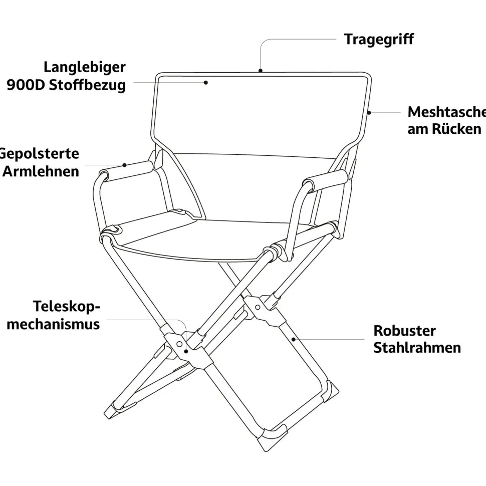 Der Campingstuhl kommt inklusive einer wasserfesten Tragetasche, damit Dein Camping-Klappstuhl jederzeit trocken und gut verpackt bleibt. Mit Hilfe der seitlichen Befestigungsschlaufen an der Tasche lässt er sich zudem ganz einfach überall befestigen, sodass er auch auf buckeligen Offroad-Pisten stets gut verstaut bleibt.