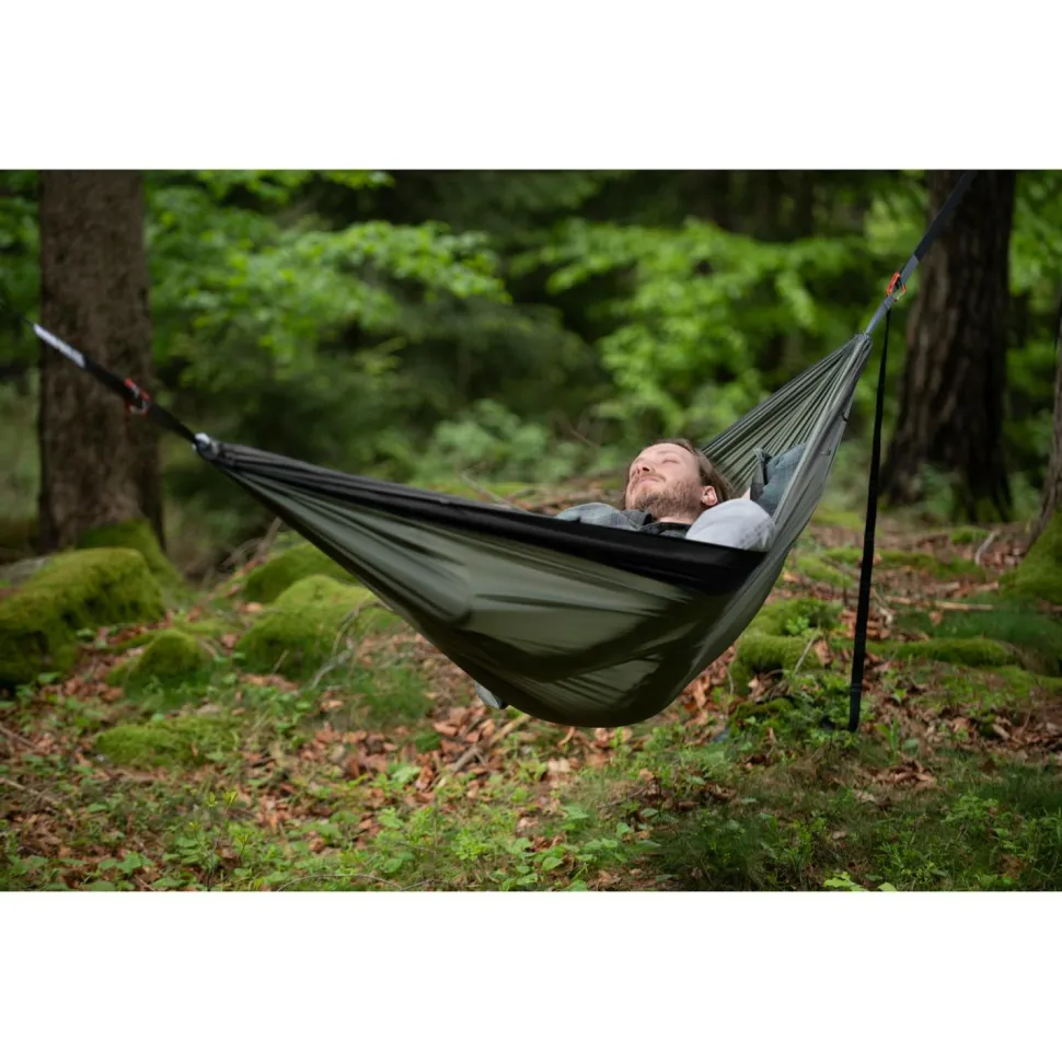 Zu zweit abhängen und genießen: Die Travel Hammock Double Hängematte von Cocoon überzeugt mit durchdachten Details und großzügigen Dimensionen für einen rundum erholsamen Liegekomfort. Weiches und gleichzeitig starkes 70 Denier Diamond Ripstop Nylon macht das gute Stück bequem und robust. Superstarke Vierfachnähte halten was aus und der praktische Packsack sorgt dafür, dass sich die Hängematte im Gepäck schön klein macht. Zwei Aluminium-Karabiner sind im Lieferumfang enthalten.