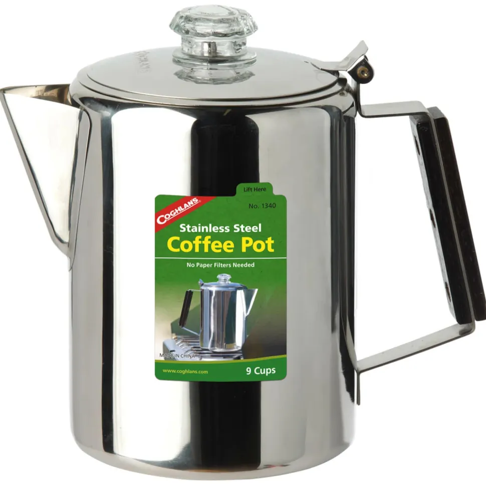 Für frischen Kaffee direkt vom Campingkocher – die Coffee Pot Edelstahlkanne von Coghlans. Aus hochwertigem Edelstahl gefertigt mit 2-teiligem Percolatoreinsatz, Henkelgriff und durchsichtigem Kunststoffknopf zur Kontrolle des Brühvorgangs. In zwei Ausführungen erhältlich, die für 9 bis 12 Tassen Kaffee reichen.