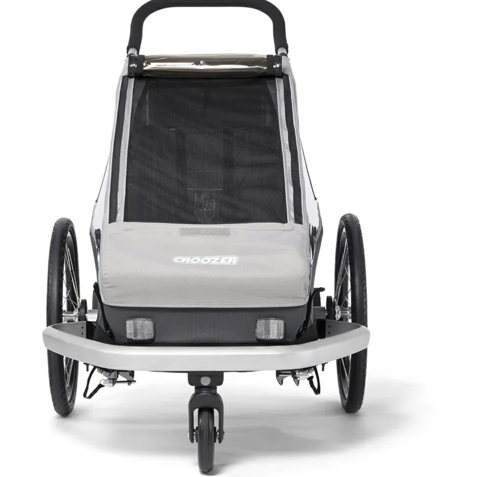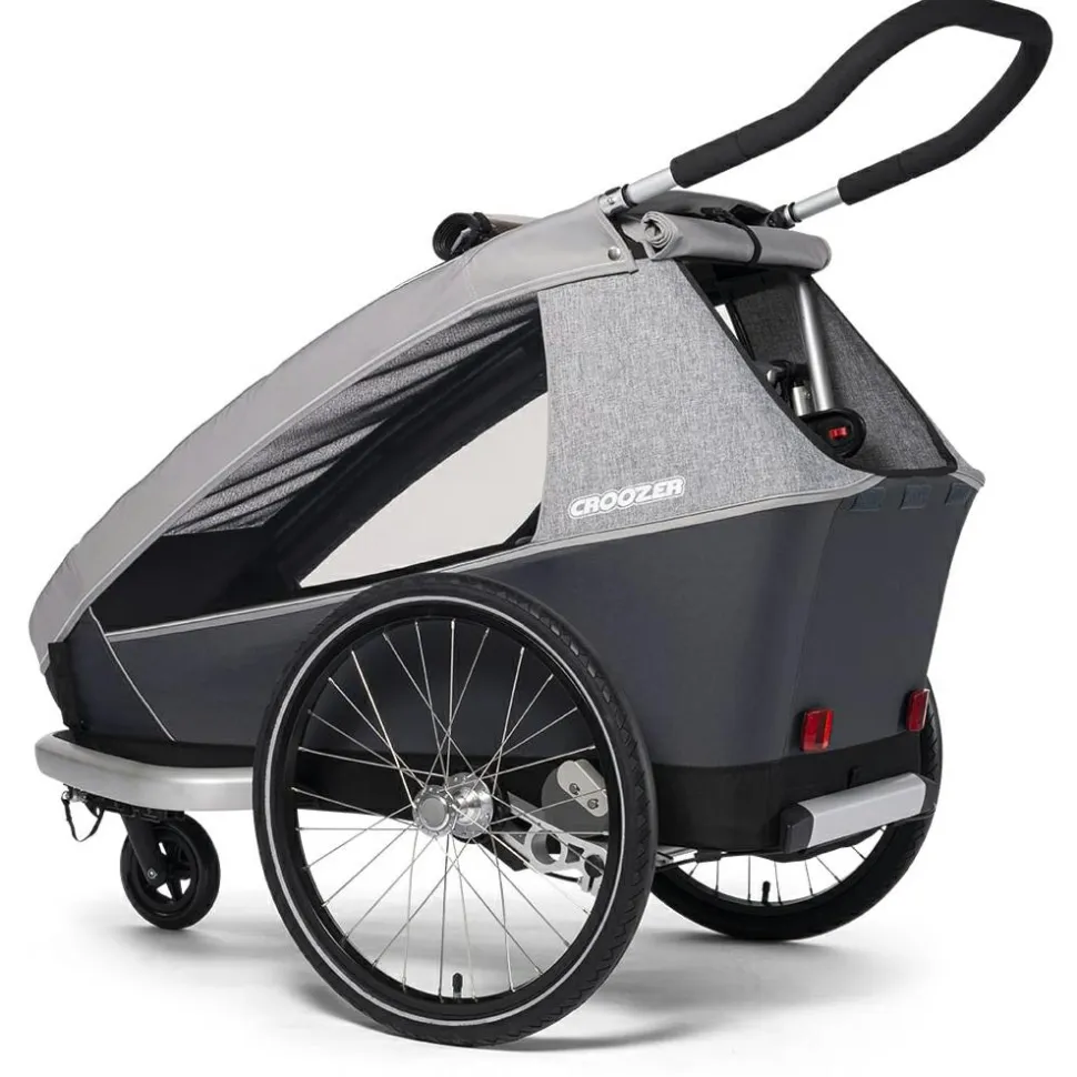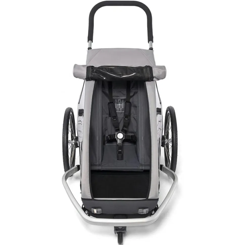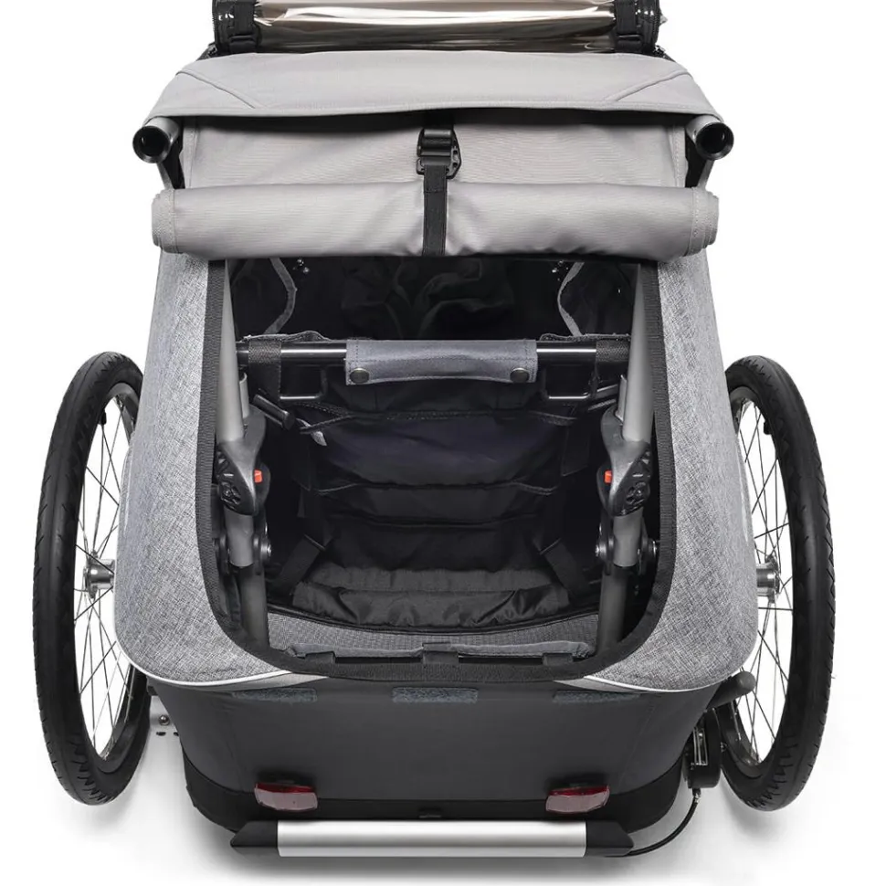 Der Kinderanhänger kann entweder am Fahrrad befestigt oder als Buggy genutzt werden, beide Sets sind im Lieferumfang enthalten. So kann man ganz entspannt mit dem Fahrrad in die Stadt rollen und den Anhänger mit wenigen Handgriffen bereit für das Schlendern durch Altstadtgassen machen. Der Schiebebügel ist hierfür in zwei verschiedenen Positionen montierbar. Zudem bietet der Kofferraum genügend Stauraum für Wickeltasche und Co.