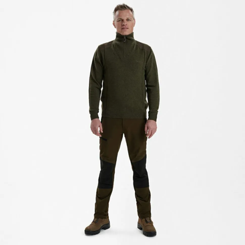 Mit dem Sheffield Knit with Zip Neck-Pulli haben Deerhunter einen echten Klassiker mit ein paar Updates neu aufgelegt! Das Gewebe besteht zwar immer noch größtenteils aus dem „Ursprungsmaterial“ Lammwolle (70%), wurde aber mit Polyacryl und etwas Elasthan veredelt, was in der Zusammenschau ein sehr stimmiges Gesamtbild erzeugt. Denn die tollen Eigenschaften des Naturmaterials Wolle -sehr gute Temperaturregulierung, isolierend, wärmend auch in feuchtem Zustand- werden so kombiniert mit der guten Formbeständigkeit der Kunstfaser, sowie deren kürzeren Trocknungszeit, und das Elasthan erhöht den Tragekomfort durch seinen Stretch.