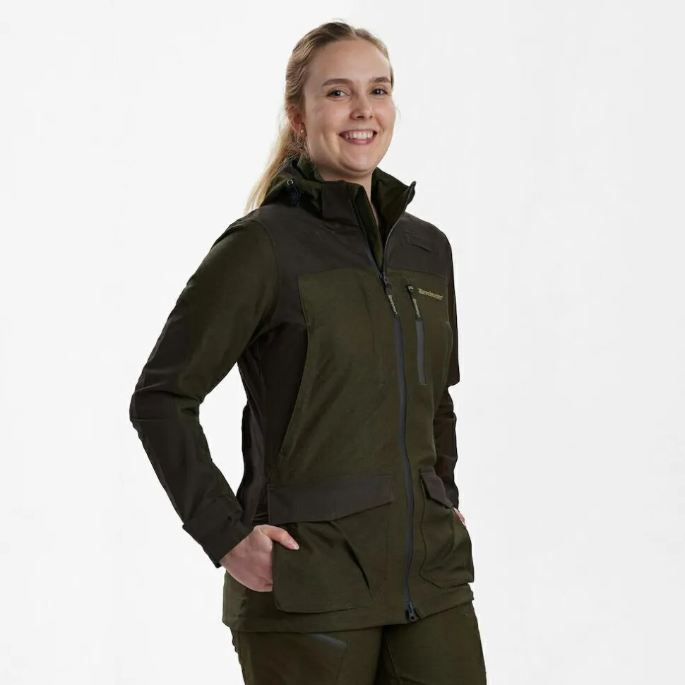 Die Women’s Chasse Jacket von Deerhunter ist für den anspruchsvollen Einsatz in der Natur gemacht. Die hochwertigen Materialien lassen Regen und Wind keine Chance, sich einen Weg ins Innere zu bahnen. Kleinigkeiten lassen sich in den vielen geräumigen Taschen der Jacke so verstauen, dass sie unterwegs sicher und schnell greifbar sind. Um den Kopfbereich vor dem Wetter schützen zu können verfügt die Jacke über eine Kapuze. Sie kann nach Belieben eingestellt und abgenommen werden.
