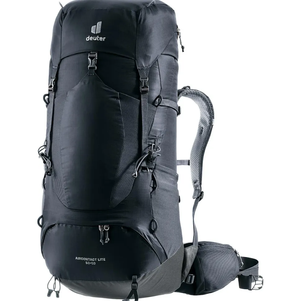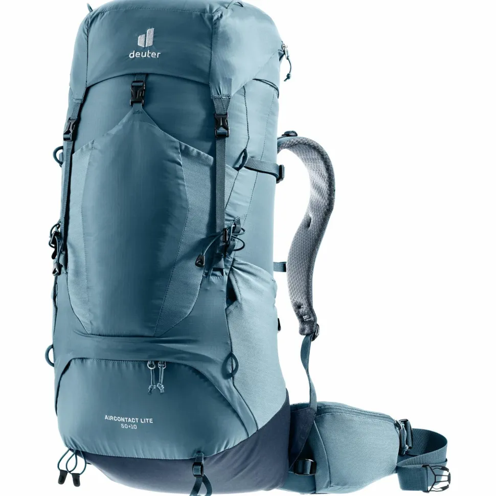 Leicht, komfortabel, geräumig – der Aircontact Lite 50 + 10 von deuter! Der Trekkingrucksack kommt mit einem Volumen von 50 Litern, lässt sich aber dank seinem höhenverstellbaren Deckel auf bis zu 60 Liter erweitern. Dadurch bietet er ausreichend Platz, um alles Wichtige für die nächste Trekkingtour, aber auch Reise mitzunehmen. Der Rucksack besitzt mehrere Fächer, um den Inhalt sinnvoll zu verpacken. So gibt es neben einem Hauptfach noch ein Bodenfach, das sich ideal für den Schlafsack anbietet. Zudem gibt es ein geräumiges Deckelfach für alle Dinge, die man schnell bei sich haben möchte. Hinzu kommen ein Wertsacheninnenfach sowie ein Fach für schmutzige Wäsche, ein elastisches Frontfach und zwei seitliche Fächer.