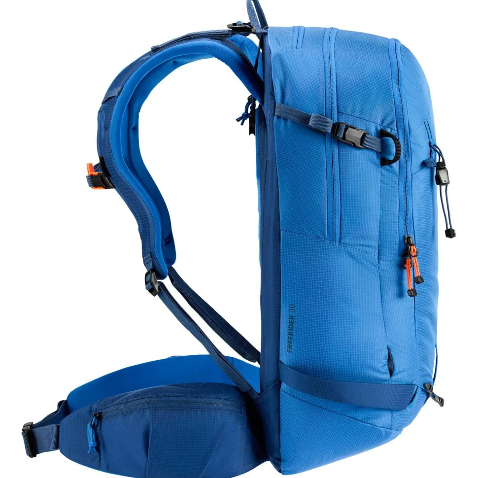 Dank der großen Rückenöffnung garantiert der Freerider schnellen Zugriff auf das Hauptfach. Der rundum laufende Reißverschluss ist dabei so unterhalb der Schulterträger eingesetzt, dass keine Träger oder Riemen beim Öffnen stören. So können Skier, Snowboard oder Steigeisen beim Ein- und Auspacken befestigt bleiben. Das Fach für die Lawinensicherheitsausrüstung ermöglicht schnellen Zugriff auf dieses essenzielle Equipment im Notfall. Perfekt abgerundet wird der Freerider 30 durch raffinierte Details wie das fleecegefütterte Goggle-Fach!