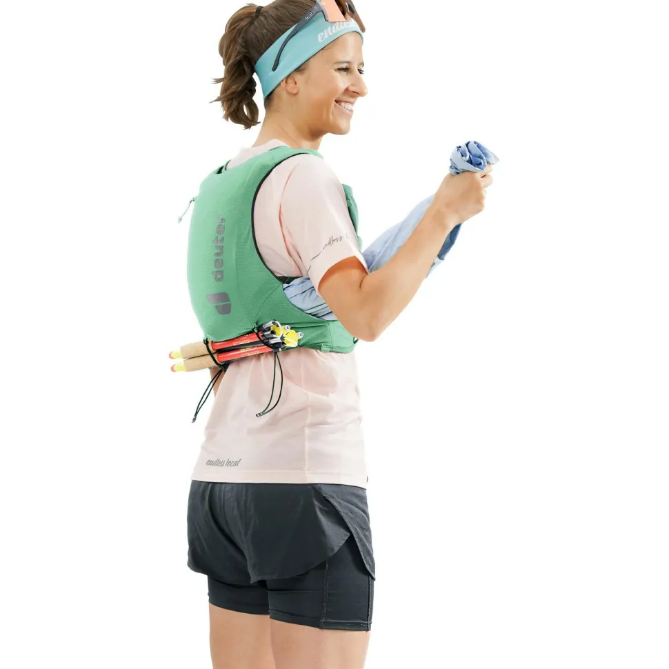 Der Women’s Traick 9 SL schneidet sowohl im Bereich Nachhaltigkeit, als auch im Bereich Leichtigkeit gut ab.deuter legt Wert auf eine umweltfreundliche, ressourcenschonende Herstellung. Somit erfüllt der Women’s Traick 9 SL die Anforderungen des Grünen Knopfs und des bluesign products.Damit Dich der Women’s Traick 9 SL nicht in den Bewegungen und der Atmung bei Deinem Berglauf einschränkt, hat er eine besonders körpernahe und elastische Passform. Auch der Brustgurt ist elastisch und individuell einstellbar. Die SL-Kollektion ist besonders für Menschen mit schmaleren Schultern und Rücken geeignet.Durch das Extrafach für Trinksysteme bis zu 2l und Fächer für zwei Softflasks bleibst Du auch bei langen Läufen gut hydriert.