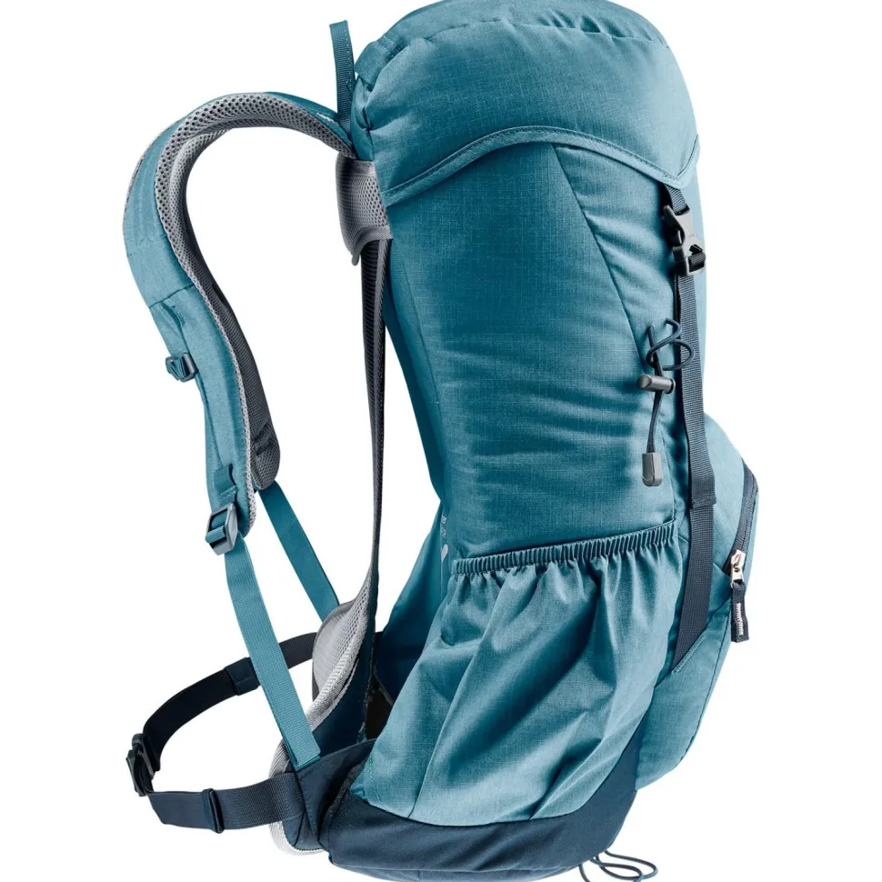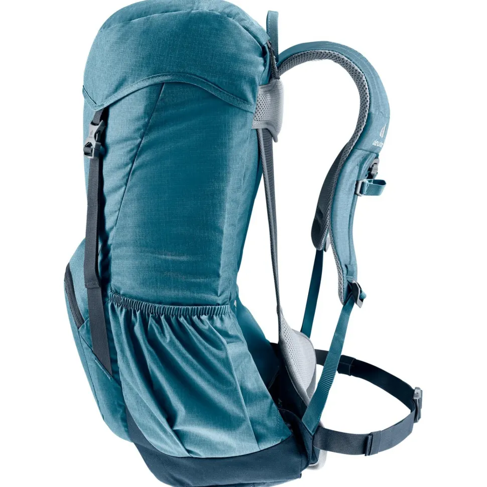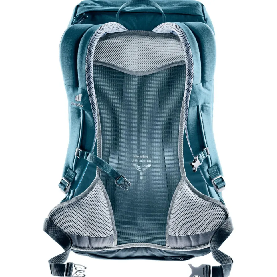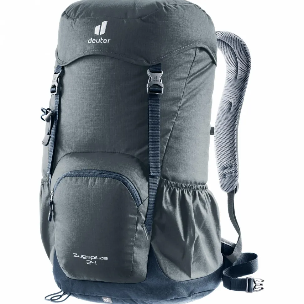 Der Wanderrucksack Zugspitze 24 von deuter ist ein top ausgestatteter Daypack für alle, die den Retro-Look lieben, aber auf modernen Komfort nicht verzichten möchen. Ein flexibler Rundprofilrahmen aus dauerelastischem Federstahl, gepolsterte Schulterträger sowie analog zur Beckenform modellierte Hüftpolster mit Bauchgurt sorgen für einen komfortablen Transport des Wandergepäcks. Das bewährte deuter Aircomfort Belüftungssystem sorgt auch bei heißen Temperaturen und schweißtreibenden Passagen für einen angenehm trockenen Rücken.Zwei seitliche Stecktaschen, ein großes Frontfach mit Reißverschluss, ein Wertsachenfach und ein Stretch-Innenfach erleichtern die Gepäckorganisation und bieten auf insgesamt 24 Litern komfortablen, sicheren Stauraum. Eine mitgelieferte Regenhülle ist im Bedarfsfall schnell über den Rucksack gezogen.Der Zugspitze 24 von deuter ist zudem mit zwei Deckelschließen ausgestattet, die zusätzliches Verstauen von Kleidung unter dem Deckel ermöglichen.