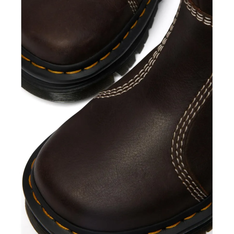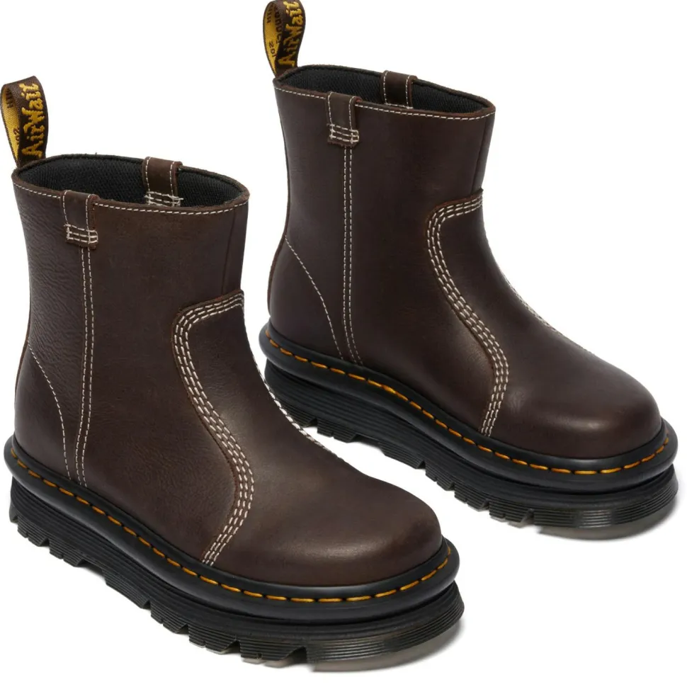 Der Women’s Zebzag Rigger von Dr. Martens ist ein knöchelhoher Stiefel, der mit seinem dunklen Leder und der klassischen Silhouette direkt ins Auge fällt. Das Obermaterial aus Dark Brown Wyoming Leder ist strapazierfähig und leicht strukturiert und perfekt für alle, die einen Schuh suchen, der auch nach häufigem Tragen noch gut aussieht. Die dunkle Farbe lässt sich vielseitig kombinieren und passt sowohl zu urbanen Outfits als auch zu lässigen Freizeitlooks.