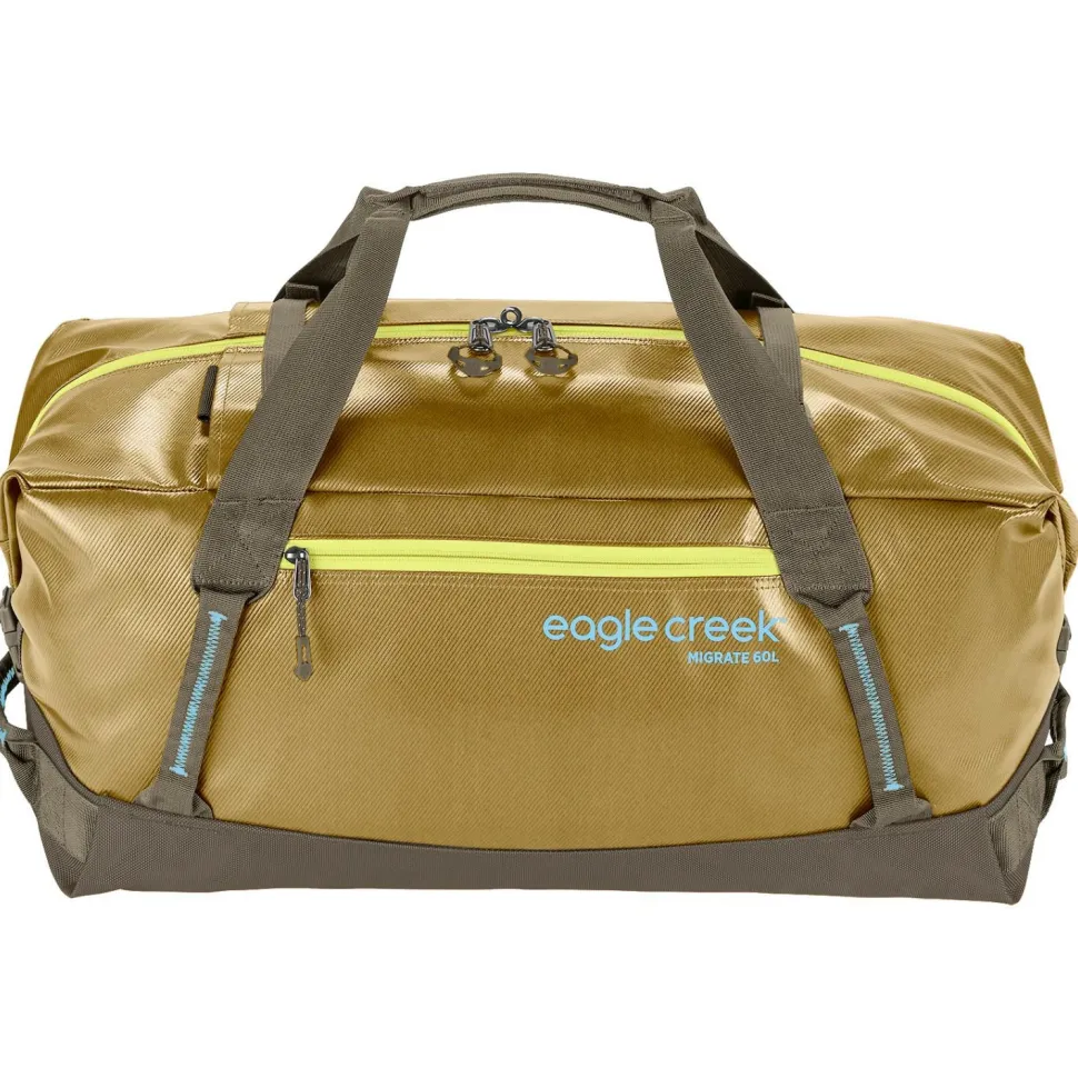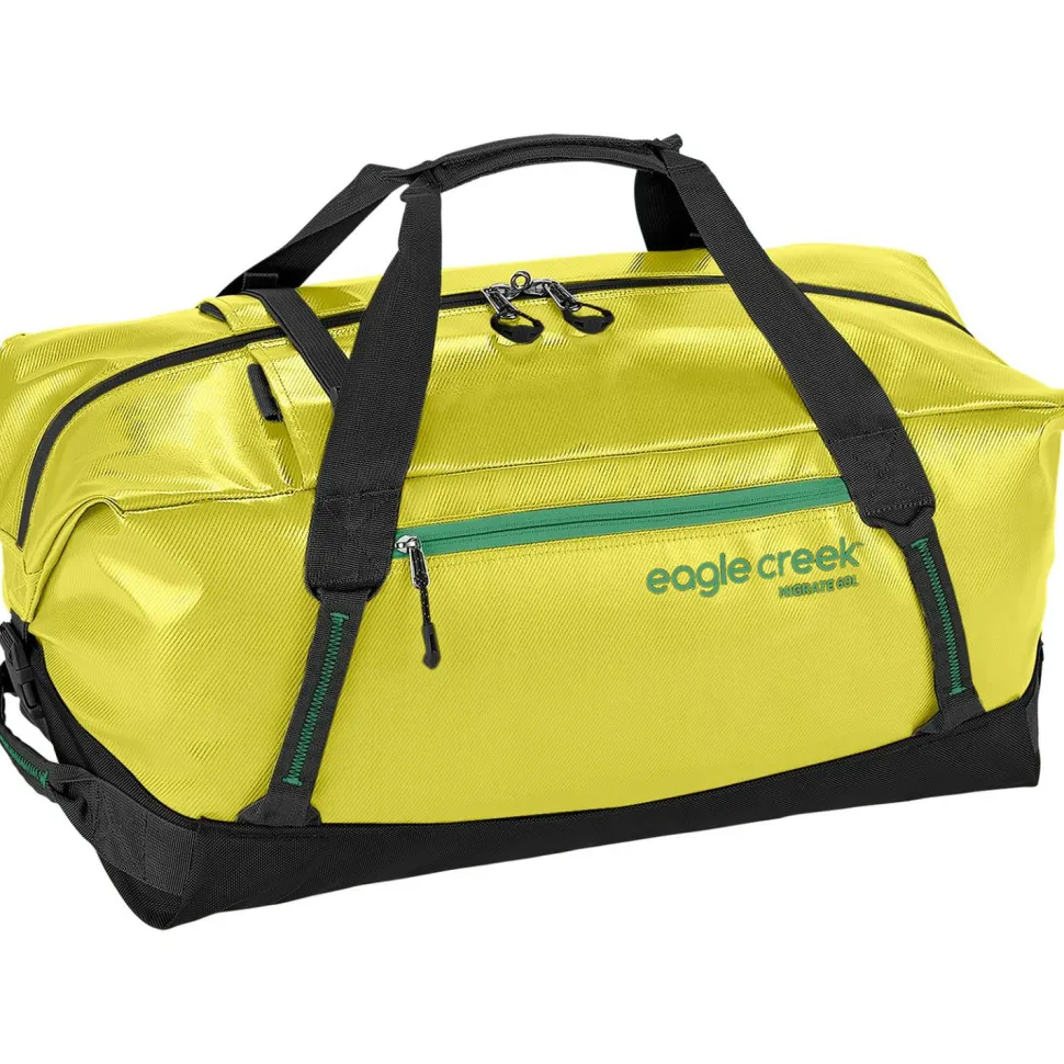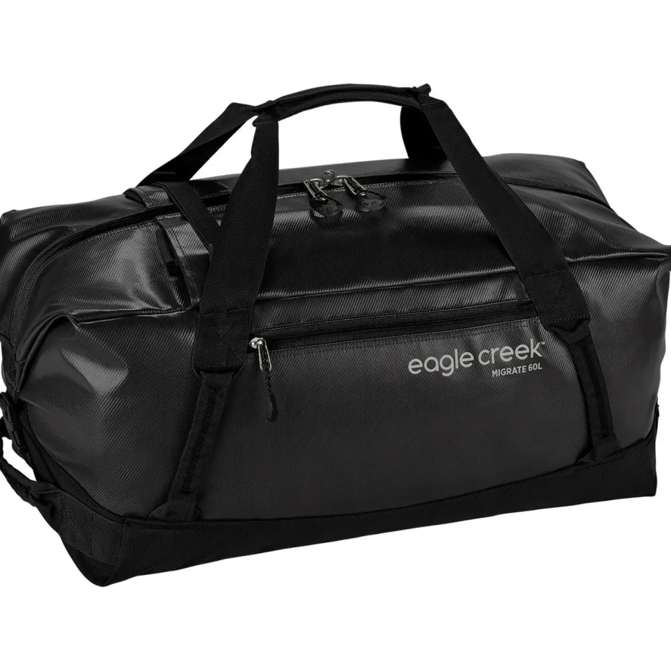 Die Migrate Duffel 60 L von eagle creek, ist eine robuste und gut durchdachte Reisetasche. Das Hauptfach ist durch einen großen Reisverschluss zugänglich, welcher abschließbar ist und durch eine große Schlaufe auch mit Handschuhen bedienbar ist. Zusätzlicher Stauraum kann man durch die Lösbaren Steckschließen gewinnen. Die Rucksackgurte lassen sich schnell und einfach verstauen. Durch spezielle Techniken ist die Tasche wasserbeständig, abriebfest und Staubresistent. Zum Aufbewahren kannst Du die recycelte Migrate Duffel 60 L klein zusammen falten.