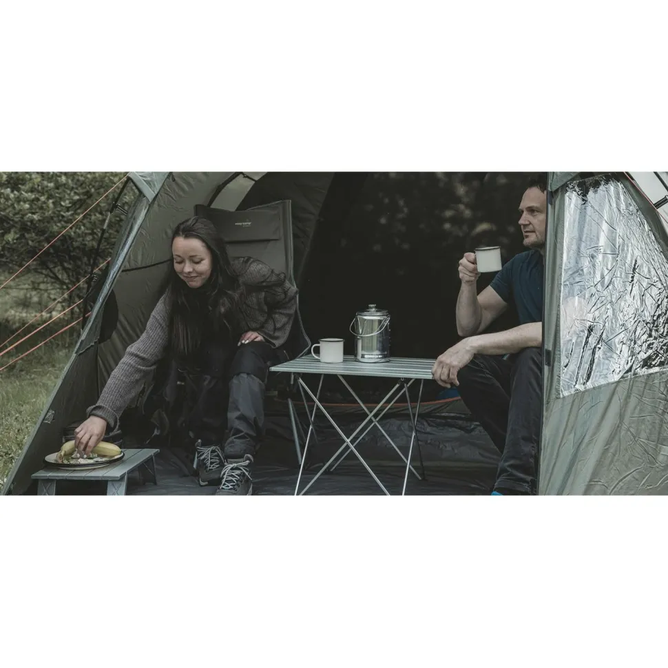 Das Innenzelt ist groß genug, dass fünf Personen bequem liegen können. Mehrere Taschen bieten hier außerdem Platz für diverse Kleinteile. Zusätzlich ist das Innenzelt abgedunkelt, was vor allem dann praktisch ist, wenn Du morgens ausschlafen willst oder die Kinder bereits ins Bett gehen, wenn es draußen noch nicht dunkel ist. Das Vorzelt ist da schon deutlich heller und kann somit nicht nur als Stauraum für Gepäck und Utensilien, sondern auch als Wohnbereich genutzt werden. Somit dient das Zelt auch als Aufenthaltsraum an Tagen mit Niederschlag.