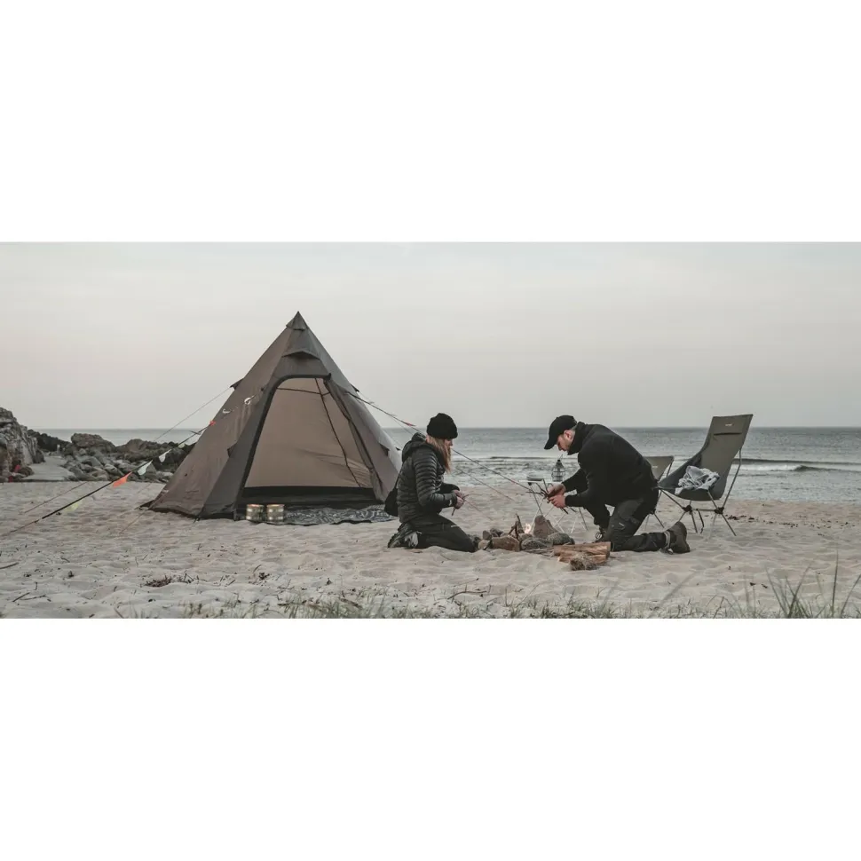 Aber auch auf praktische und schicke Details musst Du beim Otra Tipi nicht verzichten. Hierzu gehören beispielsweise mehrere Lüftungsöffnungen, die für eine optimierte Luftzirkulation im Zelt ermöglichen. Die vorderen Abspannleinen des Zelts sind mit kleinen Fähnchen ausgestattet. Das sieht nicht nur gut aus, sondern sorgt auch für eine bessere Sichtbarkeit der Schnüre.