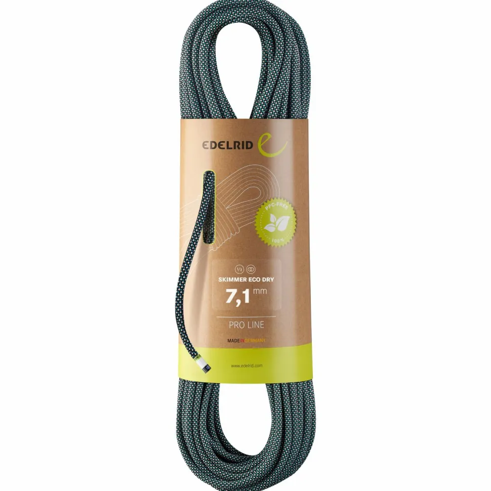 Das Skimmer Eco Dry 7,1 Halbseil von Edelrid ist das leichteste und dünnste Halbseil auf dem Markt. Zudem verfügt es über eine PFC-freie Eco-Dry Veredelung. Das Seil kann durch die 3D-Lapcoiling Technologie direkt ausgepackt und eingesetzt werden. Hier muss es keine Angst mehr vor einem lästigen Verkrangeln geben.Das Seil ist als Halb-und als Zwillingsseil zertifiziert, und kann so bei vielen Einsatzbereichen, wie beispielsweise dem Eisklettern eingesetzt werden. Zudem ist das Seil bluesign zertifiziert. Dies bedeutet, dass das Seil umweltfreundlich hergestellt wurde. Neben den vielen technischen Eigenschaften sieht das Seil einfach gut aus. Es macht Lust auf Klettern. Die Thermo-Shield Technologie ermöglicht zudem ein angenehmes Handling.