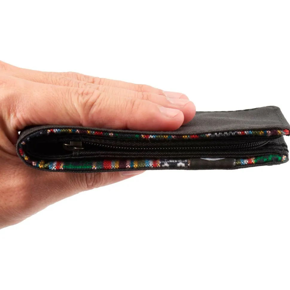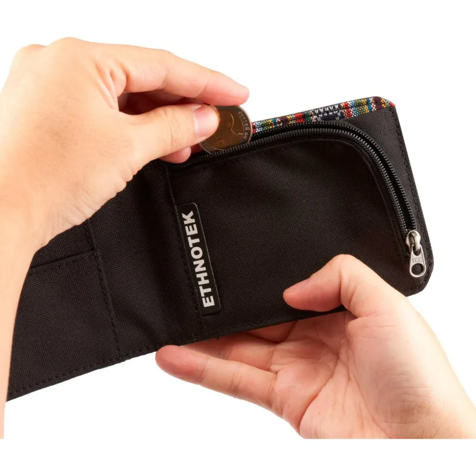 Mit dem Ketat Wallet von Ethnotek hast Du Deine wichtigsten Karten, Bargeld und Münzen immer griffbereit – ganz gleich, ob im Alltag oder auf Reisen. Das durchdachte Innenleben mit Organizer-Fach, drei separaten Kartenfächern, einem Reißverschlussfach für Münzen sowie einem eigenen Bereich für Scheine und Quittungen sorgt dafür, dass alles seinen Platz hat und schnell gefunden ist. Besonders beruhigend: Der integrierte RFID-Schutz verhindert zuverlässig das Auslesen Deiner sensiblen Kartendaten durch Dritte. So kannst Du Dich entspannt auf das Wesentliche konzentrieren – Deine Abenteuer.