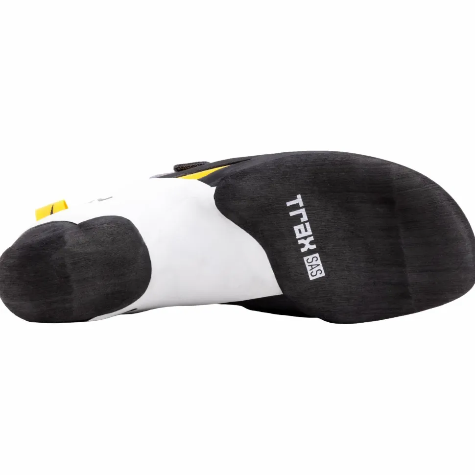 Die Kletterschuhe Shaman von Evolv sind genau richtig zum Bouldern und Sportklettern in steilstem Gelände. Durch die starke Vorspannung, den stark asymmetrischen Leisten und den Downturn (=konkave Vorspannung der Schuhsohle im Vorderfußbereich zur Erhöhung des Anpressdruckes der Zehenspitzen) lässt sich mit den Kletterschuhen auch auf kleinen Leisten gut stehen. Der Effekt wird durch den ‚Love Bump‘, eine Wölbung unter den Zehen, noch verstärkt – außerdem entsteht dadurch kein leerer Raum unter den Zehen.
