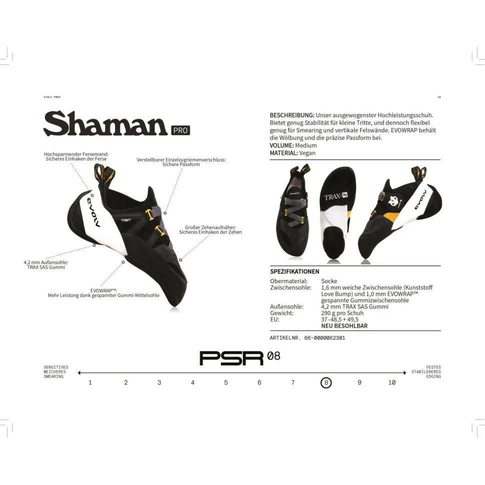 Die Shaman Pro sind ein besonders sensitives Modell, damit Du jeden Griff genau erfühlen kannst. Durch die Kombination aus starker Vorspannung, Downturn (= konkave Vorspannung der Schuhsohle im Vorderfußbereich zur Erhöhung des Anpressdruckes der Zehenspitzen) und stark asymmetrischen Leisten findest Du auch auf kleinsten Leisten aus jedem Winkel guten Halt. Zusätzlich verfügen die Kletterschuhe über einen Gummi-Rand am Obermaterial, welcher Dir bei Toe Hooks besonders guten Grip verschafft. Das macht die Shaman Pro von Evolv zu einem tollen Modell für ambitionierte Kletterer, denen keine Kletter-Herausforderung zu schwer ist!