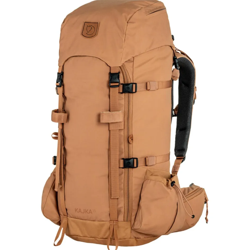 Das geräumige Innenfach lässt sich sowohl von oben als auch über einen Reißverschluss auf der Vorderseite erreichen. Das Deckelfach ist mit drei Reißverschlusstaschen ausgestattet und lässt sich bei Bedarf abnehmen, um es als Daypack zu nutzen. Eispickel oder Wanderstöcke lassen sich bequem außen am Trekkingrucksack befestigen. Die beiden Seitentaschen lassen sich verschließen und eignen sich ideal für Trinkflaschen oder andere Ausrüstung. Seitliche Kompressionsriemen und die mitgelieferte Regenhülle mit reflektierendem Details machen den Fjällräven Kajka 35 zur ersten Wahl für anspruchsvolle Touren in der Natur.