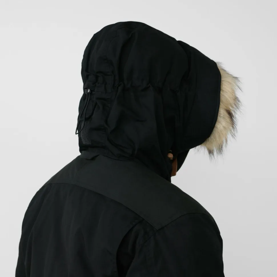 Die Kapuze des Singi Down Jacket von Fjällräven ist mit einem stylischen Kunstfellbesatz versehen. Dieser kann bei Bedarf einfach abgenommen werden. Damit die Ärmel auch bei ausladenden Bewegungen so sitzen wie sie sollen, lässt sich die Jacke hier mithilfe von Klettverschlüssen in der gewünschten Passform einstellen.