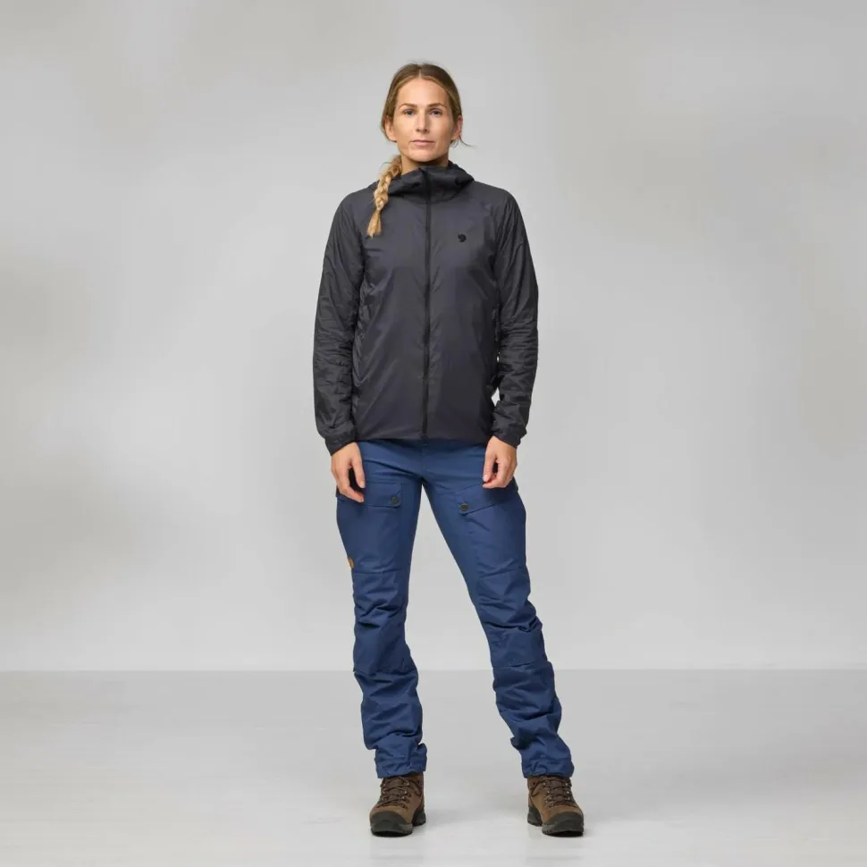 Eine PFAS-freie DWR-Behandlung an der Außenhülle sorgt dafür, dass Wassertropfen an der Jacke abperlen. Für angenehme Beweglichkeit stattet Fjällräven die Women’s Keb Thermal Wind Jacket mit Raglanärmeln und elastischen Bündchen aus.