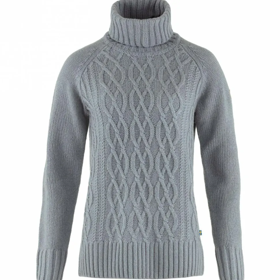 Der Women’s Övik Cable Knit Roller Neck Wollpullover von Fjällräven sieht nicht nur gemütlich aus, sondern schmiegt sich mit seinen weichen Materialien angenehm an die Haut. Wenn es draußen stürmt und schneit, lädt der Pulli zum Kuscheln auf dem heimischen Sofa ein. Ein schöner, warmer Strickpullover mit einem klassischen Zopfmuster auf der Vorderseite. Hergestellt wurde der Pullover aus hochwertiger Wolle und eignet sich perfekt als Zwischenschicht bei kühlen Herbst- oder Winterausflügen, sowohl auf dem Land als auch in der Stadt.