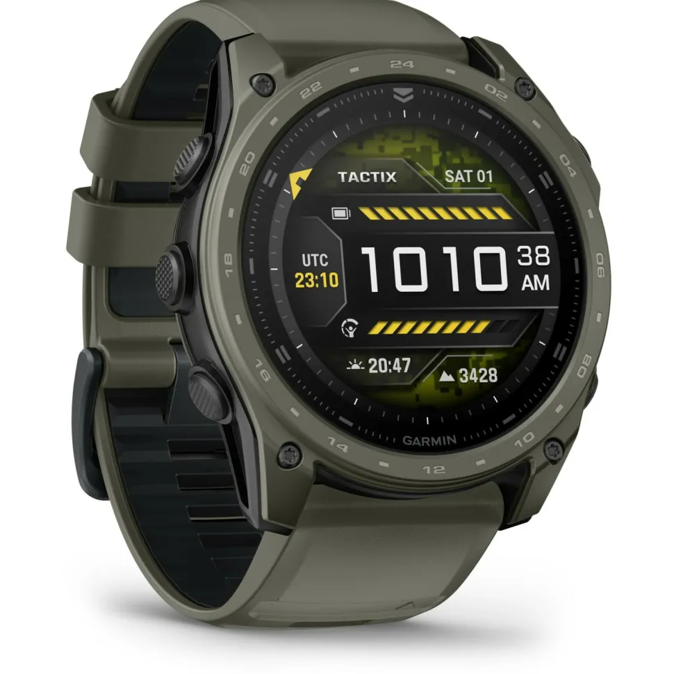 Das 51 mm Gehäuse der tactix 8 ist mit einer gehärteten Cerakote‑Keramikbeschichtung versehen, die nicht nur besonders kratz‑ und abriebfest ist, sondern der Uhr auch einen markanten, professionellen Look verleiht. Ergänzt wird die Konstruktion durch ein kratzfestes Saphirglas, eine geschützte Sensorfläche und wasserdichte, induktive Tasten.Mit einer Wasserdichtigkeit bis 10 ATM, Tauchzertifizierung bis 40 m Tiefe und einer Prüfung nach MIL‑STD‑810 ist die tactix 8 auf extreme Bedingungen ausgelegt – ob Hitze, Kälte, Nässe oder mechanische Belastung.