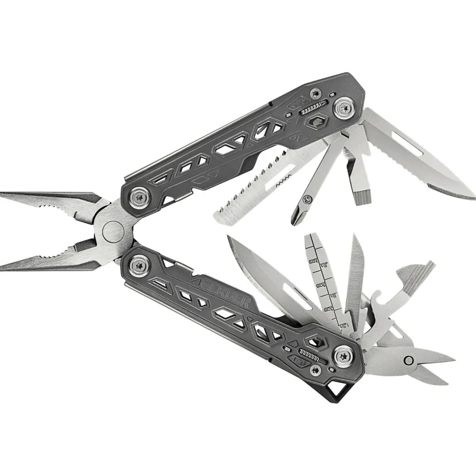 Das Multi-Tool Truss von Gerber ist kompakt und zugleich ein Riese in puncto Funktionalität: 17 Funktionen beherbergt das Tool. Im geschlossenen Zustand liegen die Werkzeuge außen für schnellen Zugriff. Alle Werkzeuge arretieren für hohe Sicherheit bei der Verwendung. Zum Lieferumfang gehört ein Nylonetui, das längs oder quer befestigt werden kann. 17 Funktionen: Spitzzange, normale Zange, Drahtschneider, glatte Klinge, Klinge mit Wellenschliff, Säge, Schere, kleiner/mittlerer/großer Flachschraubenzieher, Kreuzschraubendreher, Lineal, Feile, Abisolierer, Ahle, Dosenöffner, Kapselheber.