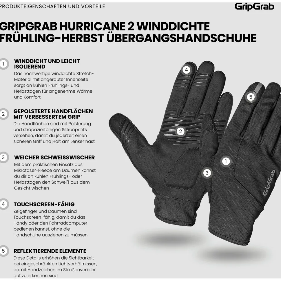 Die Hurricane 2 Windproof Spring-Autumn Gloves von GripGrab sind für kühle und windige Tage im Frühjahr und Herbst konzipiert. Dabei bieten die Fingerhandschuhe sehr guten Windschutz und verhindern unangenehmes Auskühlen durch kalte Luft und Fahrtwind. Gleichzeitig sorgen die Radhandschuhe für angenehmen Tragekomfort und präzise Beweglichkeit. Die Handschuhe sind mit griffigen Handflächen und praktischem Wischdaumen ausgestattet. Auch die Bedienung von Touchscreens am Smartphone, Smartwatch oder Navi ist problemlos möglich. So sind die warmen Fahrradhandschuhe perfekt für Touren und Training bei kühlem Wetter geeignet.