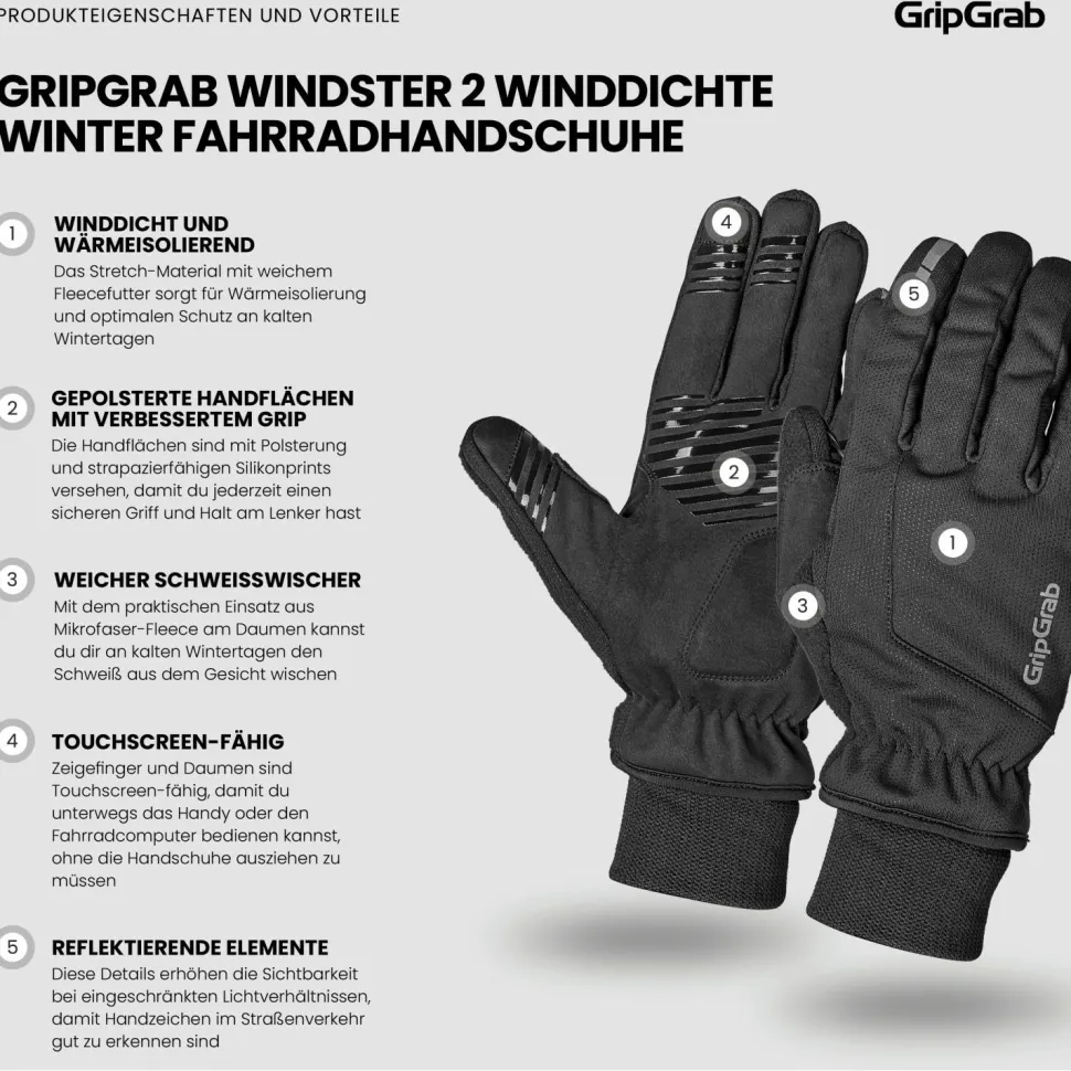 Vor Wind und Kälte beim Radtraining und bei Radtouren schützen die Windster 2 Windproof Winter Gloves Handschuhe von GripGrab optimal. Die windundurchlässigen und warmen Handschuhe bestehen aus einem funktionellen Material-Mix und garantieren tollen Tragekomfort bei eisigem Winterwetter. Die Handschuhe sind an den Fingern und Handinnenflächen mit einer griffigen Silikonbeschichtung versehen und verfügen über reflektierende Details und praktischen Wischdaumen. Auch die Bedienung von Touchscreens am Smartphone oder Navi sind problemlos möglich mit den warmen Winderhandschuhen für Radfahrer.