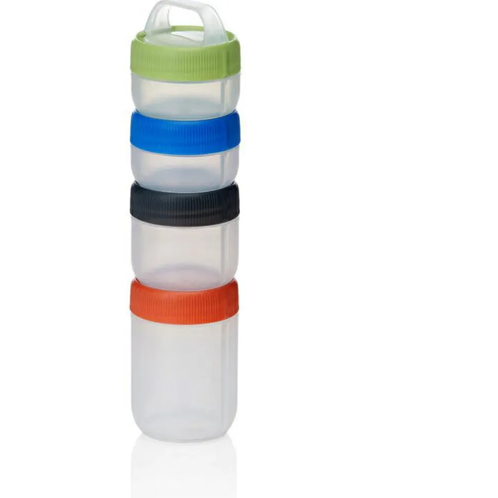 Optimal für unterwegs: die Stax Aufbewahrungsdosen von humangear kommen im praktischen 4er-Set. Kleinigkeiten können hier drin gut gelagert werden. Durch den Clipgriff kannst Du die Stax auch mit einem Karabiner außen am Rucksack befestigen.