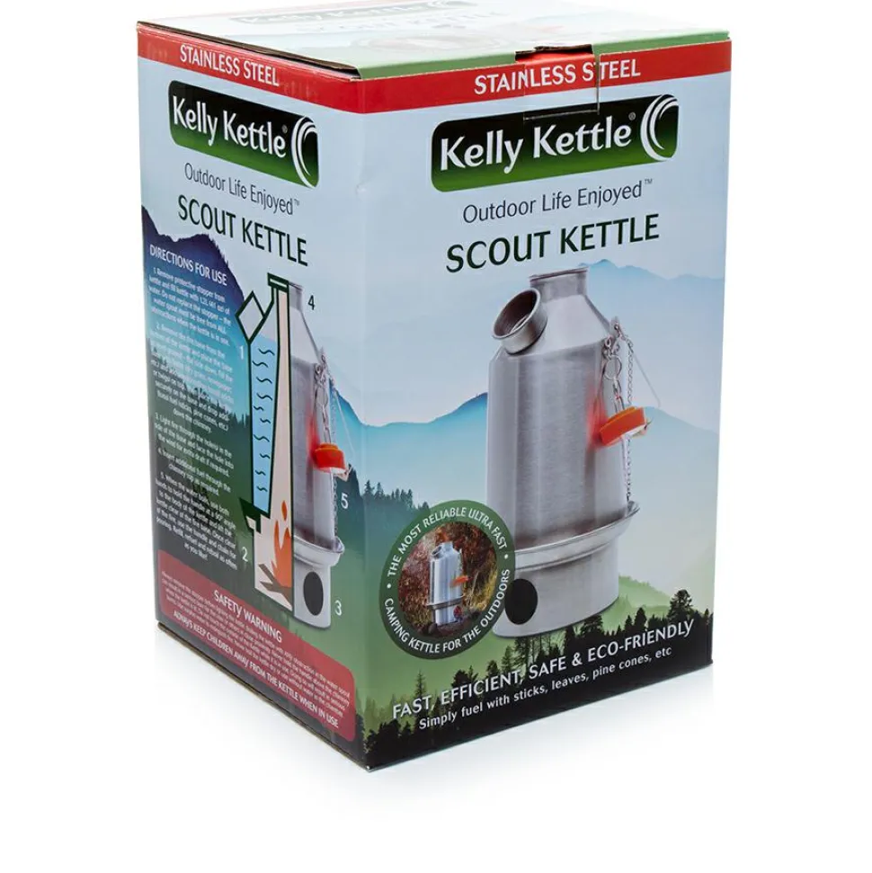 Heiße Getränke und Mahlzeiten bei jedem Wetter: die Scout Kettle von Kelly Kettle macht’s möglich! Dieser besondere Mix aus Wasserkessel und Trockenbrennstoffkocher besteht aus doppelwandigem Edelstahl und kann mit allem trockenen Brennmaterial betrieben werden. Der kaminartige Abzug sorgt zusammen mit dem stählernen Feuersockel für Schutz vor Wind und Nässe sowie für schnelles Abbrennen von Stöcken, Gras, Tannenzapfen oder anderem Material. Somit versorgt die Scout Kettle Wanderer, Angler oder Camper jederzeit und überall mit gut einem Liter heißem Wasser!