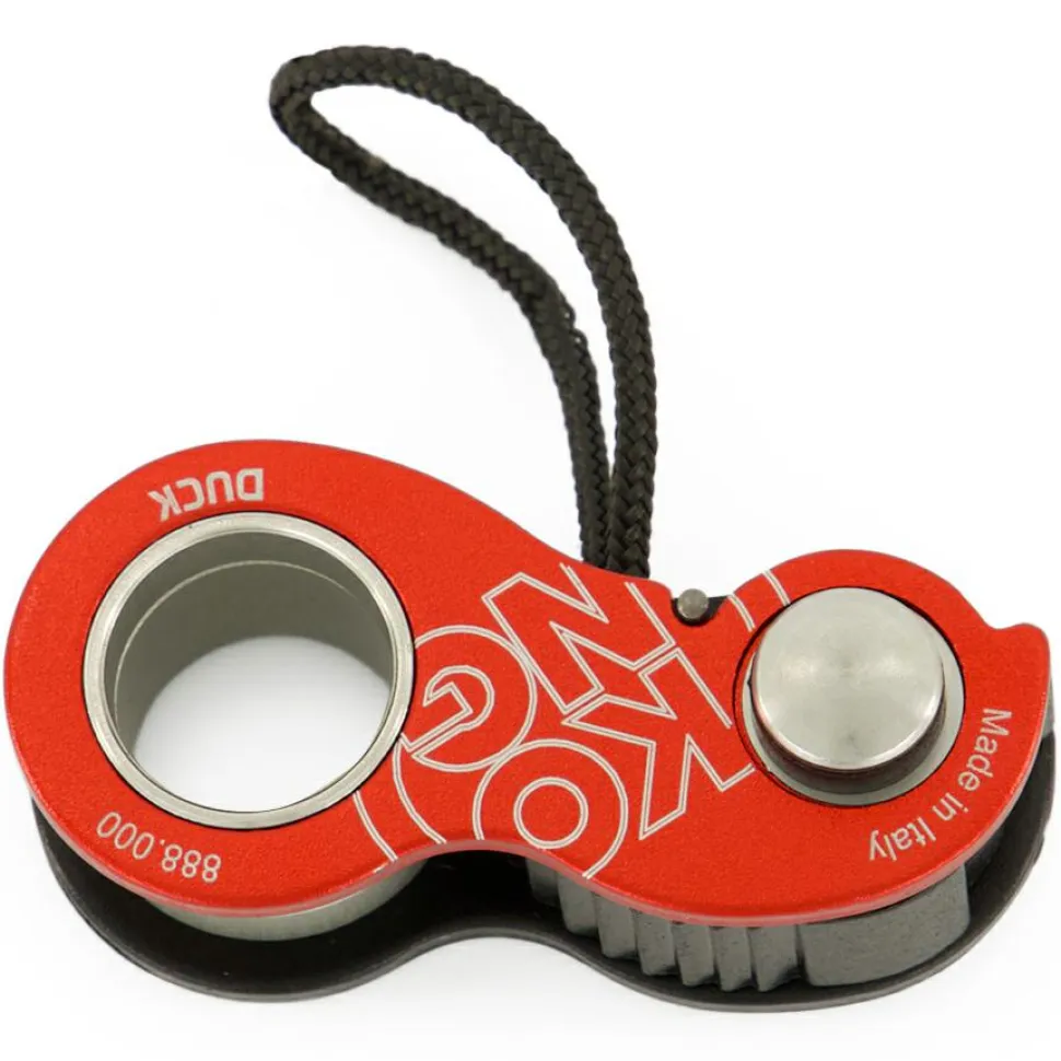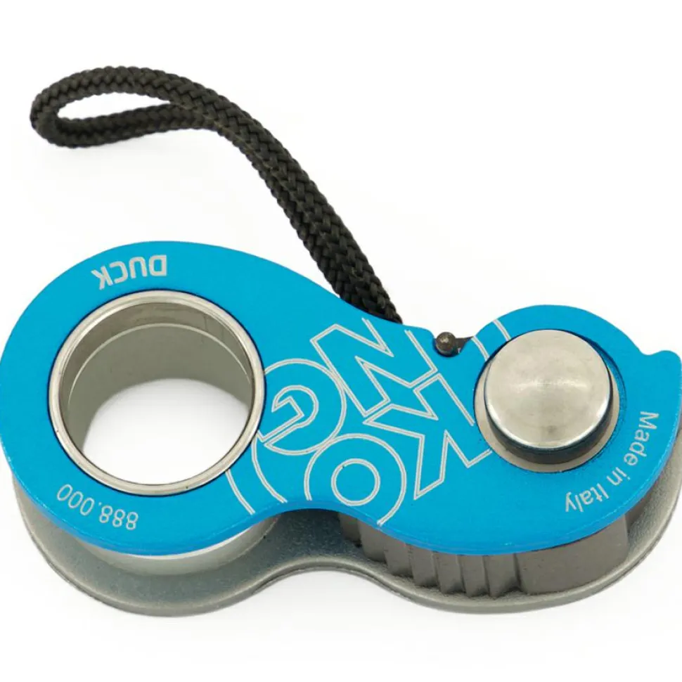 Eine Steigklemme der besonderen Art: die Duck von Kong! Im Gegensatz zu herkömmlichen Steigklemmen lässt sich dieses Modell auch mit Bandmaterial verwenden – um z.B. die Länge von Bandschlingen zu regulieren – primär ist es allerdings für Einfachseile mit einer Durchmesser von 8 bis 13 mm geeignet. Der Federmechanismus des Geräts blockiert selbsttätig und lässt sich auch mit einer Hand gut bedienen, zudem ist das Karabinerloch so großzügig dimensioniert, dass sich ein Schraubkarabiner komplett darin drehen lässt.