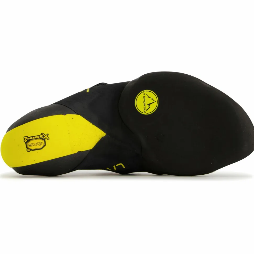 Die Sohlenkonstruktion ist sehr durchdacht: Der verwendete Gummi Vibram XS Grip 2 ist sehr weich und extrem griffig. Er ist ideal für das Stehen auf Reibung. Außerdem ist er je nach Fußbereich unterschiedlich dick. Dort, wo es auf Präzision für kleine Tritte und Leisten ankommt, ist er dicker. Wo Sensibilität und Flexibilität der Zehen gefragt sind, ist er dünner. So wird eine optimale Balance zwischen Sensibilität und Kantenstabilität erreicht. Der Fersenbereich hat ein reduziertes Volumen und bietet dadurch mehr Präzision beim Heelhooking. Ein großflächiger, ebenfalls sehr griffiger Gummibereich auf dem Spann erleichtert außerdem das Toehooking.