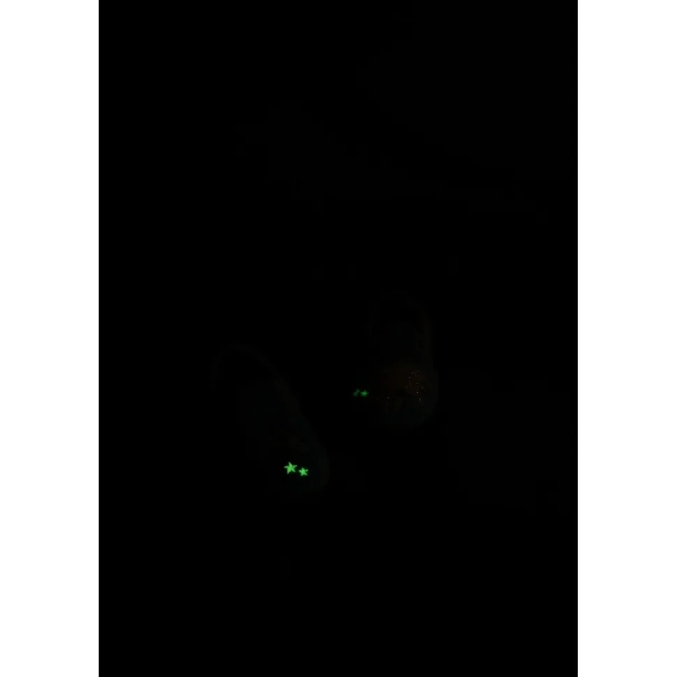 Dank elastischem Gummiband sitzt der Schuh sicher am Fuß – ganz ohne Schnürung oder Klettverschluss. Die rutschfeste Naturkautschuksohle in Naturfarbe gibt Halt auf glatten Böden. Das Highlight: Die aufgenähte Applikation leuchtet im Dunkeln und macht den Hausschuh zum echten Hingucker.