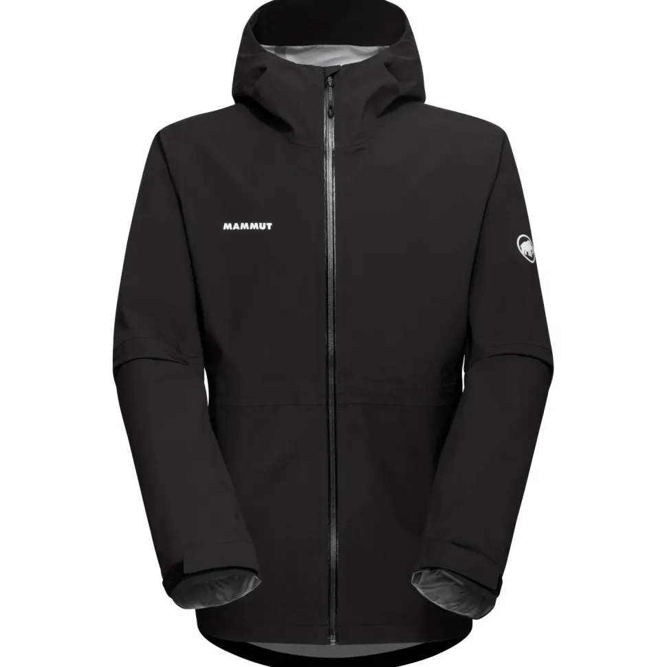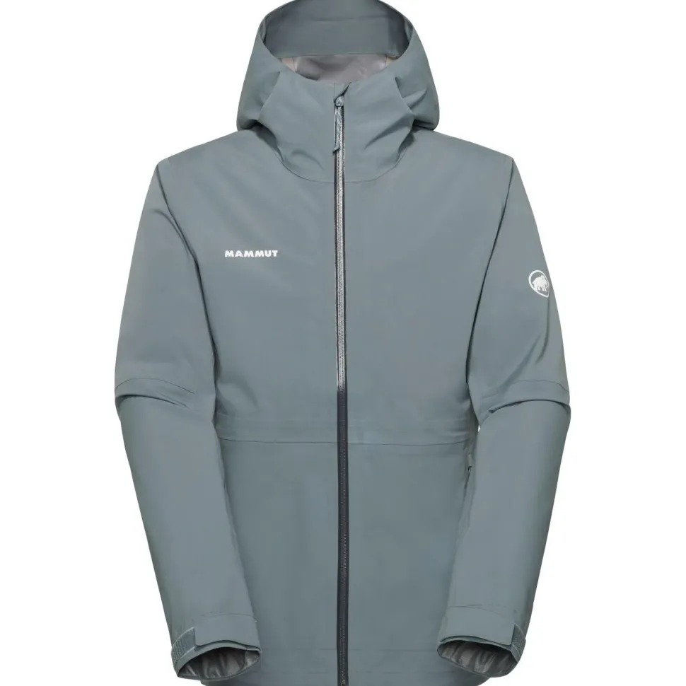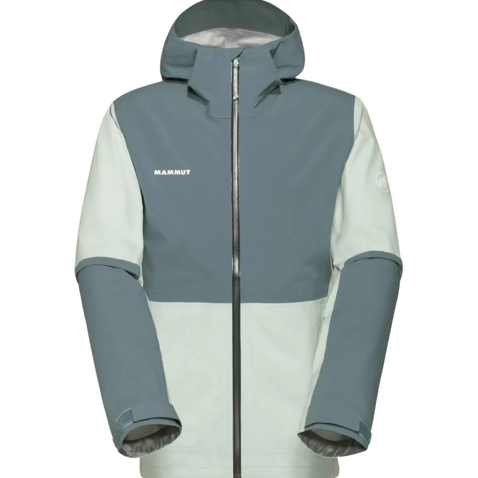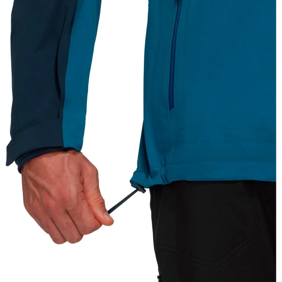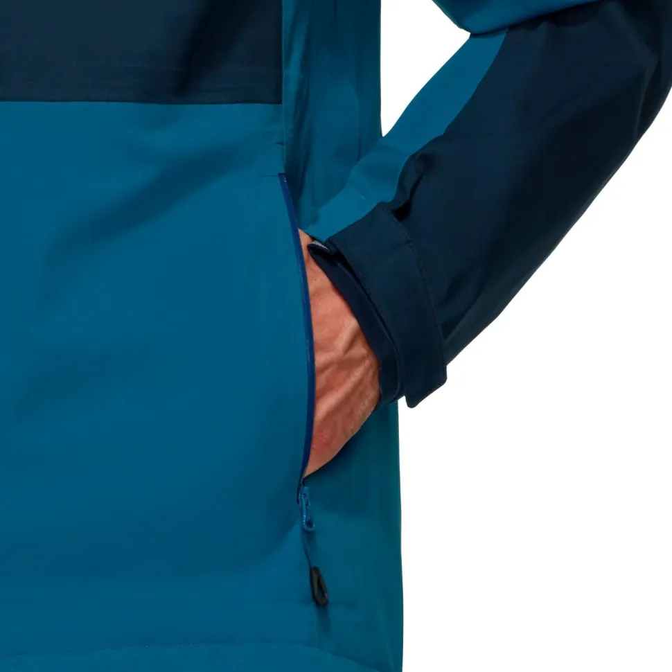 Die wasserdichte Jacke ist mit einem wasserabweisenden Frontreißverschluss ausgestattet und lässt sich per Klettverschluss und Kordelzug bequem am Saum und an den Ärmelenden einstellen. Für zusätzliche Ventilation beim Wandern sorgen die beiden praktischen Unterarmreißverschlüsse. Mammut stattet die bewegungsfreundliche Outdoorjacke mit zwei Fronttaschen aus, die sich ebenfalls mit zwei wasserabweisenden Reißverschlüssen verschließen lassen.