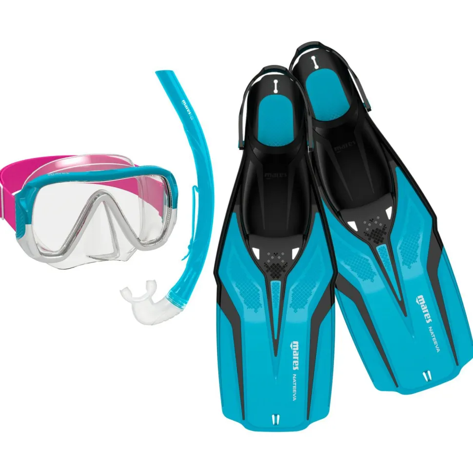 Das Schnorchelset Kid’s Set Nateeva Keewee von Mares ist praktisch für Urlaub und Hallenbad! Der Schlauch ist robust und geriffelt, während das Mundstück aus weichem Silikon besteht, um den Komfort im Wasser zu erhöhen. Das verschiebbare Schnorchelhaltersystem ermöglicht eine einfache Verwendung des Schnorchels. Die Brille überzeugt mit einem ergonomischen Sitz und einem weiten Bereich der Unterwassersicht. Die Flossen lassen sich verstellen. Ideal für den Wassersport!