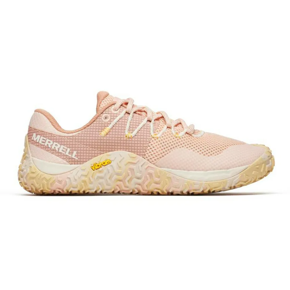 Als Außensohle kommt Vibram EcoStep zum Einsatz. Die kleinen Stollen packen im Gelände sicher zu und lassen keine Wünsche offen. Im Bereich der Zwischensohle setzt der Hersteller auf Float Pro Schaumstoff. Die Aufprallenergie wird gezielt abgedämpft, um Deine Bänder und Muskeln optimal zu entlasten. Durch den Einsatz von recycelten Materialien überzeugen die Merrell Women’s Trail Glove 7 als nachhaltige Trailrunningschuhe.