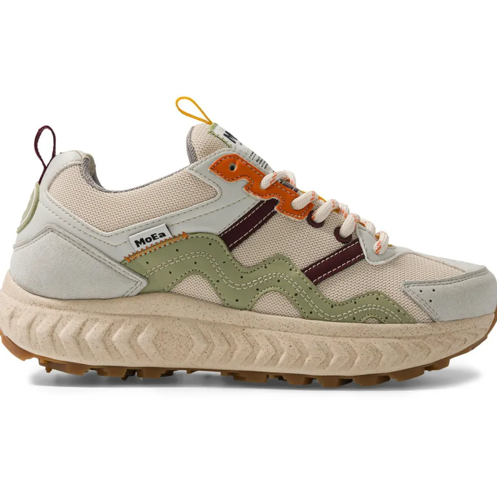 Der Gen7 Sneaker von MoEa ist besteht aus vier innovativen, veganen Materialien, die teilweise pflanzlichen Ursprungs sind. Zum Einsatz kommen: OrangeSkin, CactusSkin, CornSkin und PineappleSkin. Die Kombination sorgt für eine robuste, atmungsaktive und angenehm flexible Oberfläche – ideal leichte Wanderwegen, Städtetrips und Reisen.