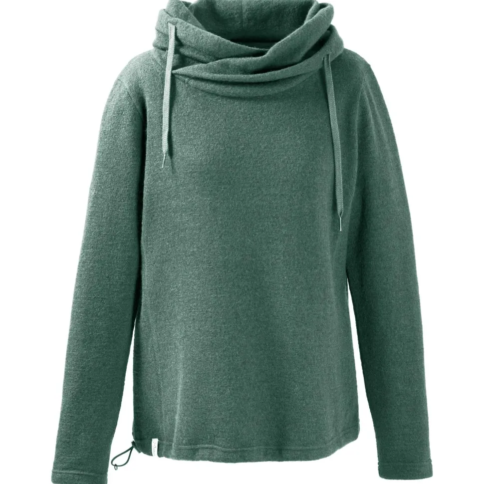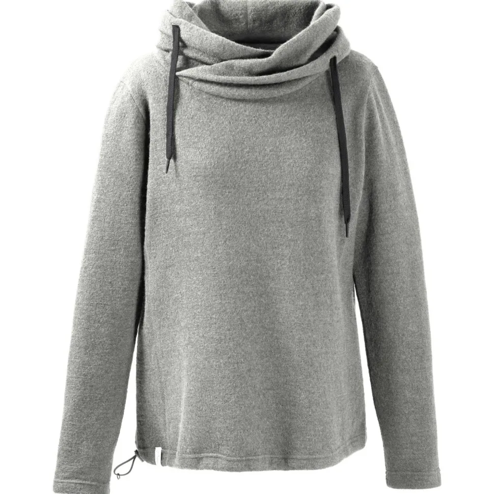 Hingucker mit Gemütlichkeitsfaktor – Der Clou beim Women’s Kusa Wollpullover von Mufflon ist die extraweite Kapuze, die sich mit einem Kordelzug individuell einstellen lässt.
