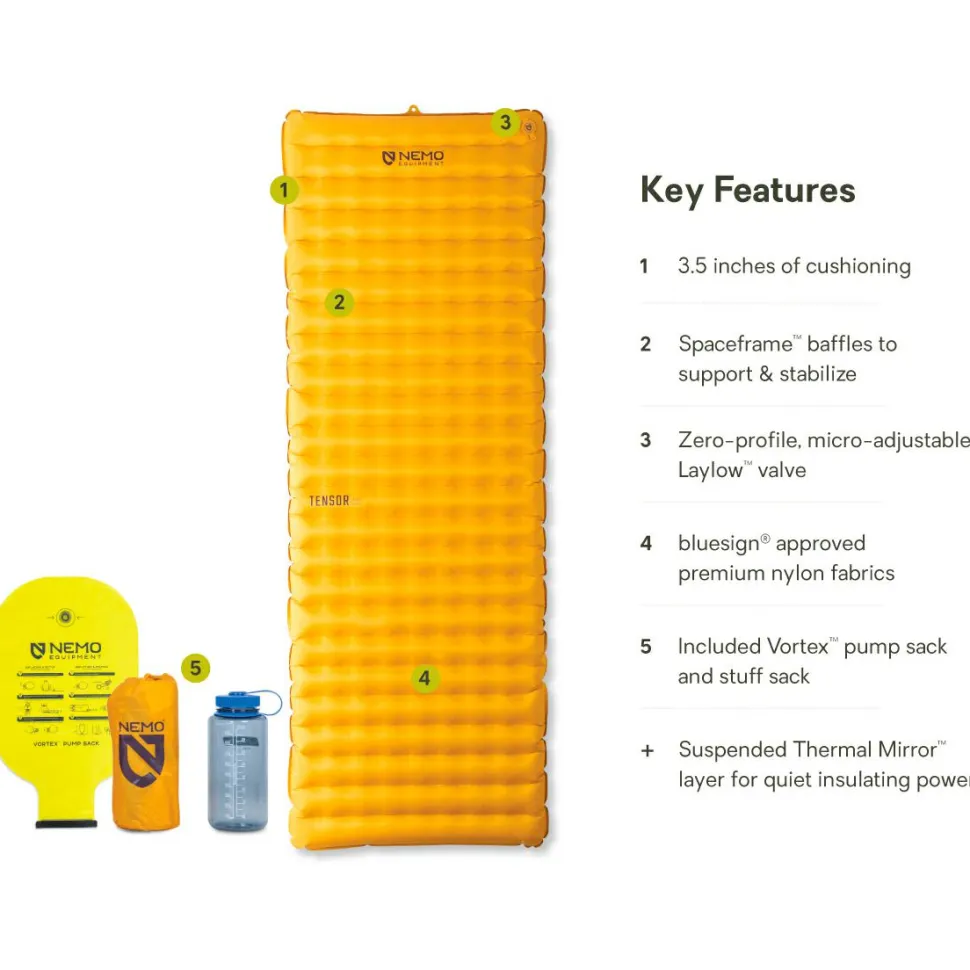 Die Tensor Trail Isomatte gibt es in unterschiedlichen Längen und Breiten. Neben der klassischen Mumienform in 183 cm Länge, bietet Nemo die Matte in den Größen „Regular“, „Regular Wide“ (Breite: 64 cm) und „Long Wide“ (Länge: 193 cm) an. So finden auch größere Personen die optimale Mattengröße für komfortablen Schlaf beim Camping.