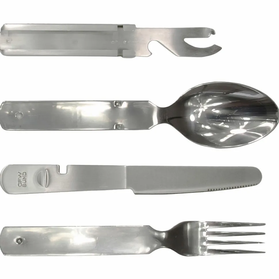 Das Bundeswehrbesteck Das Original von Origin Outdoors ist ein hochwertiges Set zum Campen! Das Set besteht aus schnitthaltigem Messer, Dosen- und Flaschenöffner, Gabel und Löffel. Es ist sehr stabil und kompakt zu verstauen.