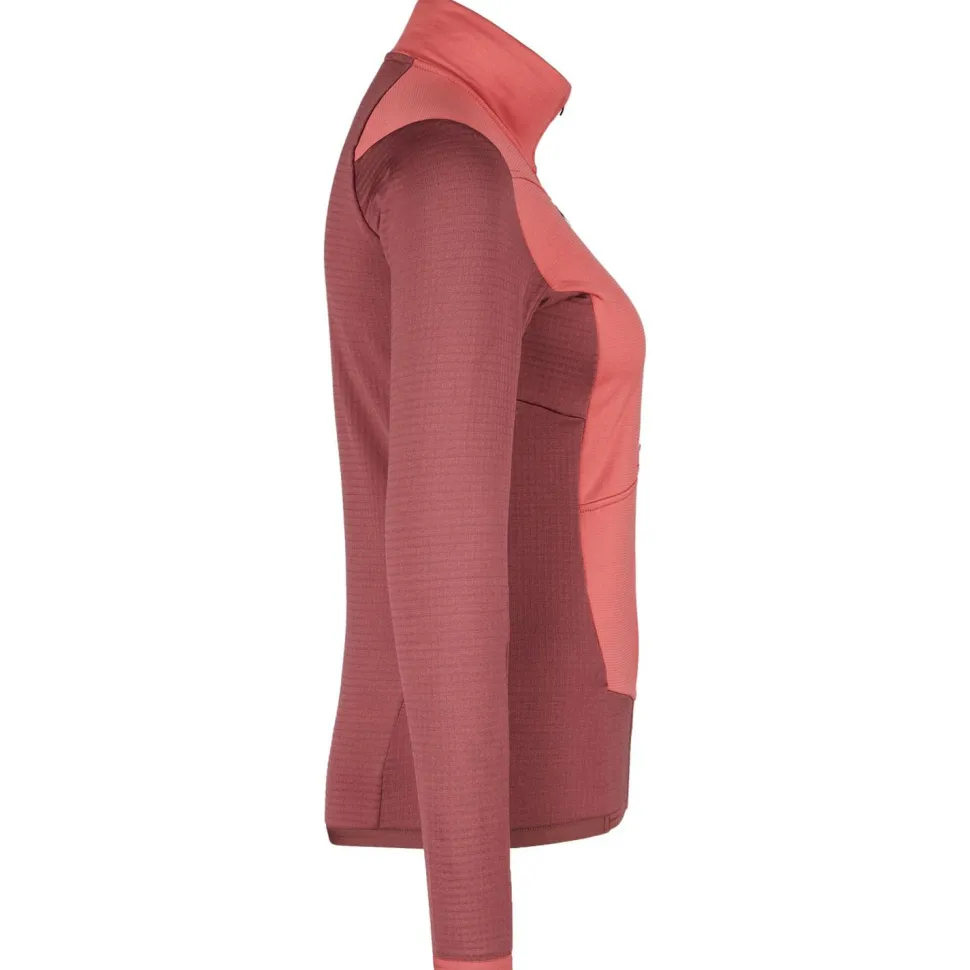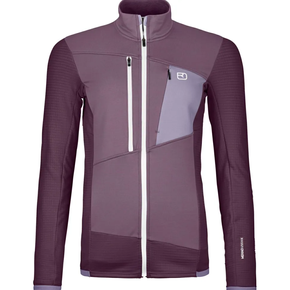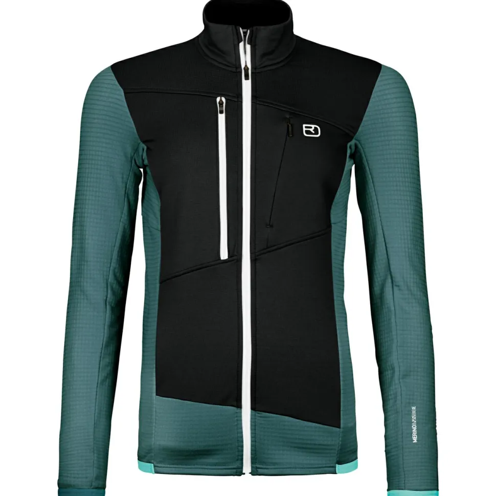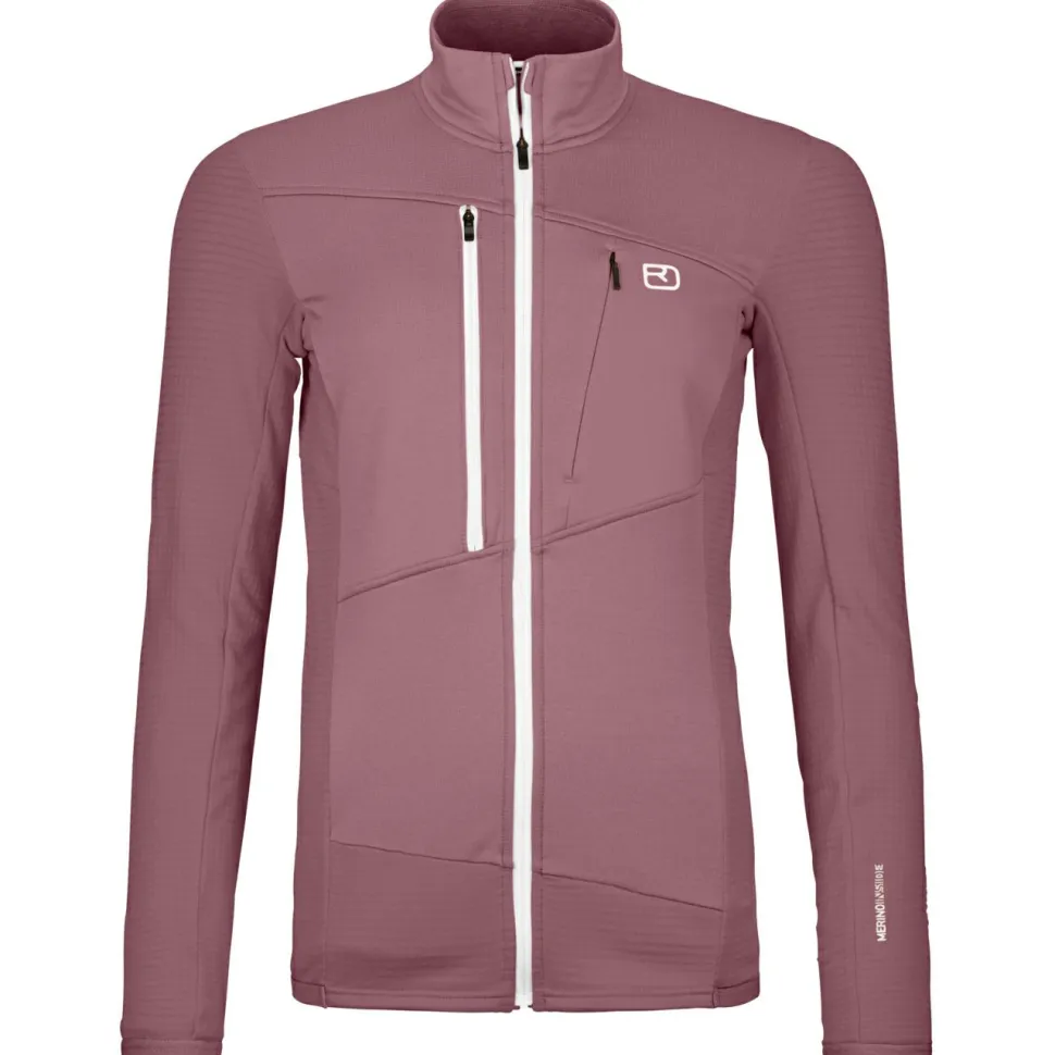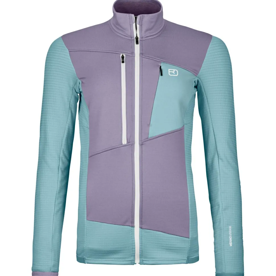 Die Women’s Fleece Grid Jacket von Ortovox liegt schon beim ersten Anprobieren angenehm weich auf der Haut und gibt eine gemütliche Wärme ab. Auch wenn es im Gebirge sportlich zur Sache geht und die Schweißperlen auf Skitour ins Rollen kommen, bleibt die Fleecejacke cool. Die strategisch platzierte Waffelstruktur aus Kunstfasern befördert Feuchtigkeit schnell an die Oberfläche und sorgt so für angenehm trockene Bedingungen. Geruchsneutrale Eigenschaften der Merinowolle verhindern auch bei Mehrtagestouren ein unangenehmes Schweiß-Aroma.