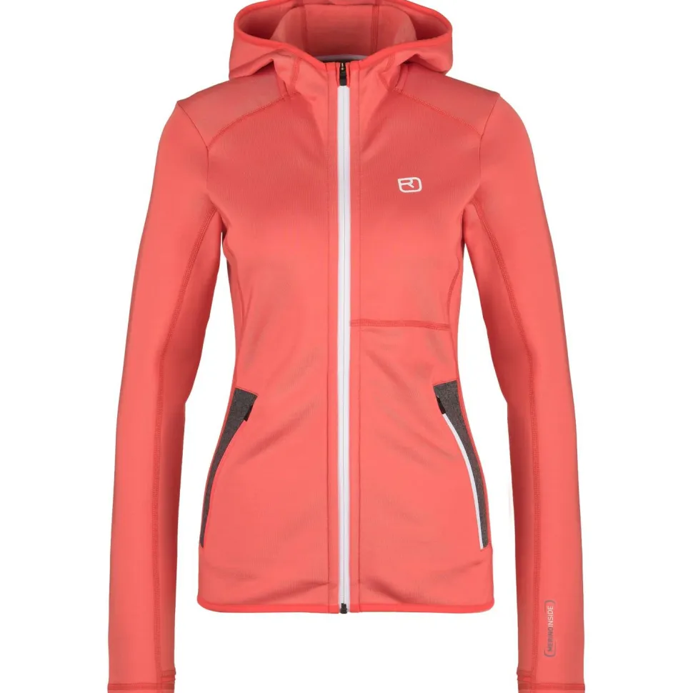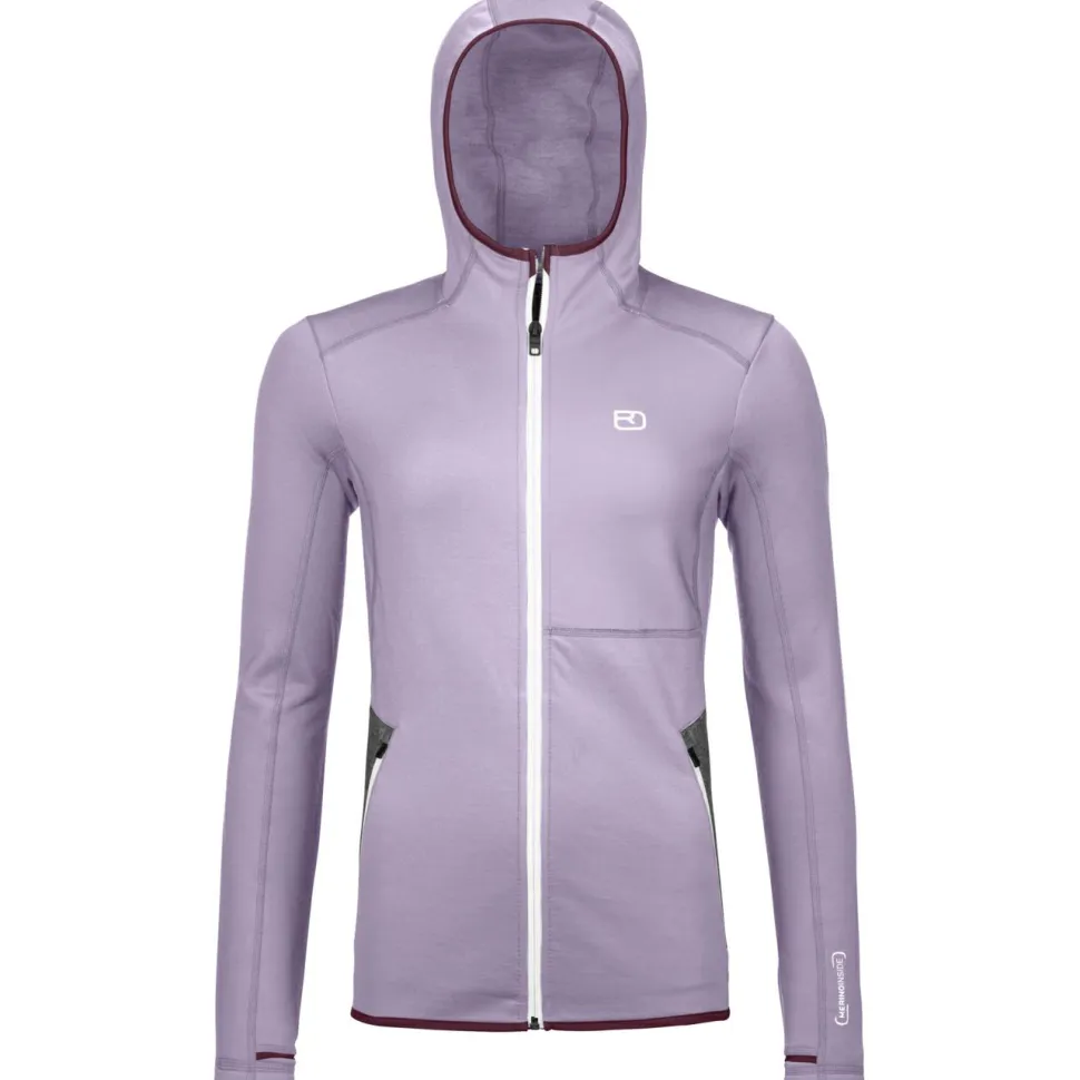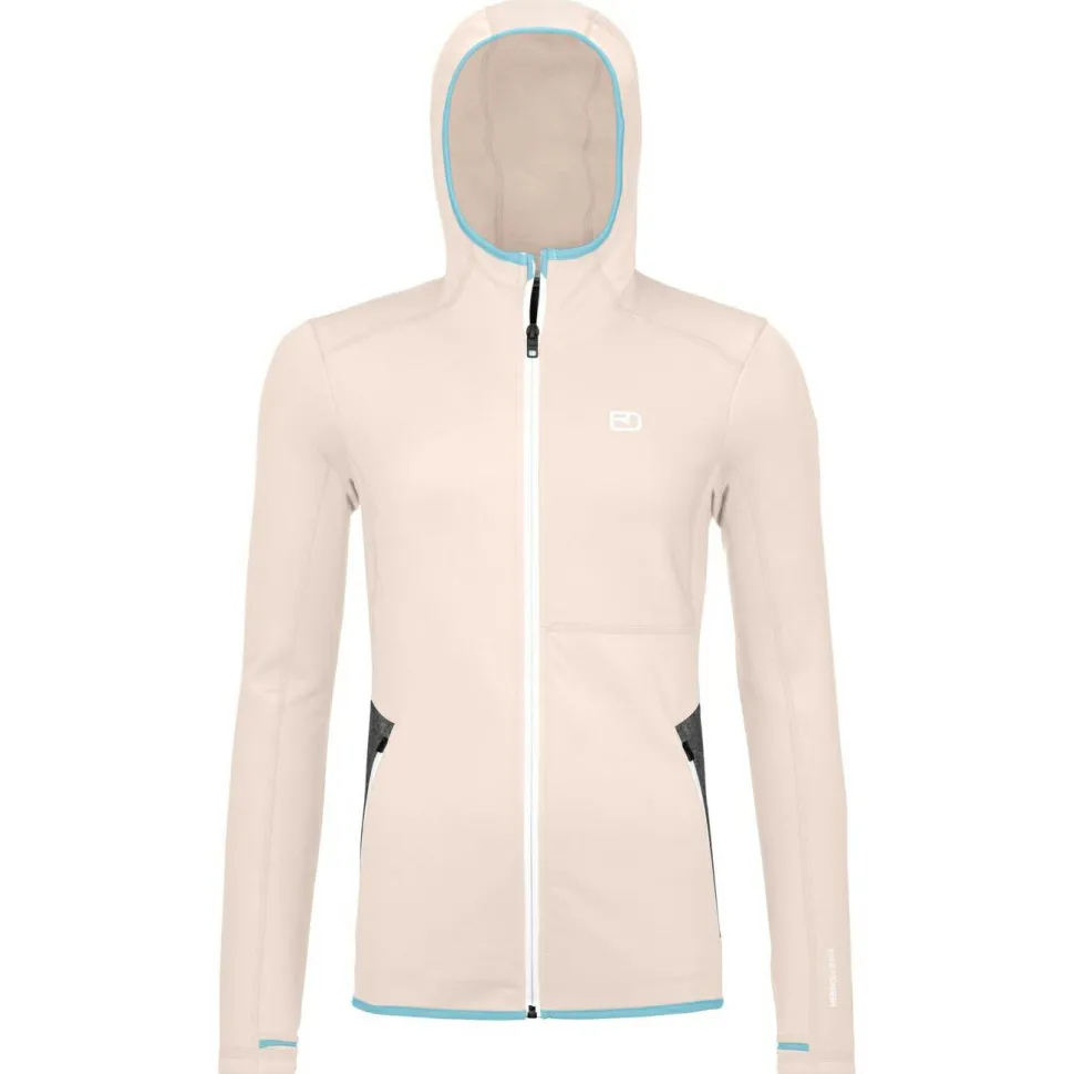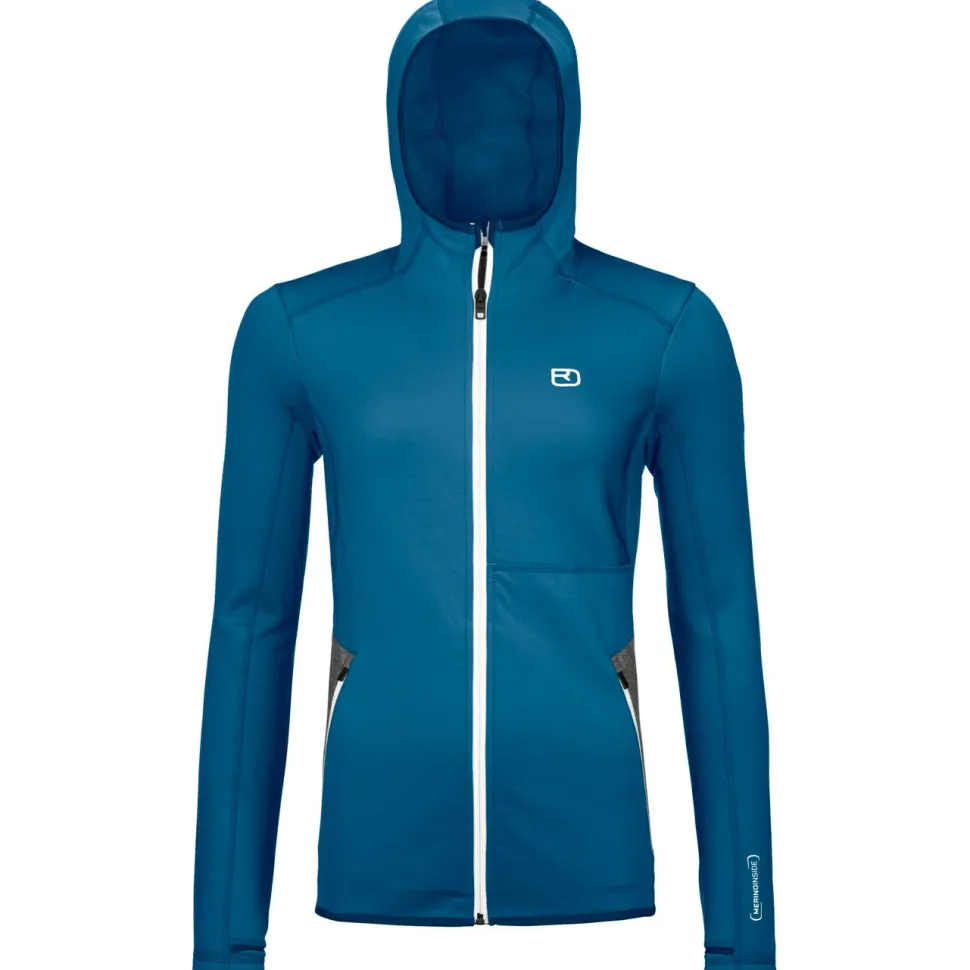 Der Women’s Fleece Hoody von Ortovox ist in jedem Fall ein toller Begleiter für Deine nächste Skitour. Er besteht aus dem funktionalen Materialmix von recyceltem Polyester und Merinowolle. Diese Mischung ist besonders widerstandsfähig und atmungsaktiv. Die warme Merinowolle liegt angenehm weich auf der Haut, sie sorgt für eine optimale Feuchtigkeits- und Temperaturregulierung und ist zusätzlich geruchshemmend und sehr pflegeleicht. Somit ist die bequeme Kapuzenjacke optimal, um sportlich aktiv zu sein und bietet ein sehr komfortables Tragegefühl.